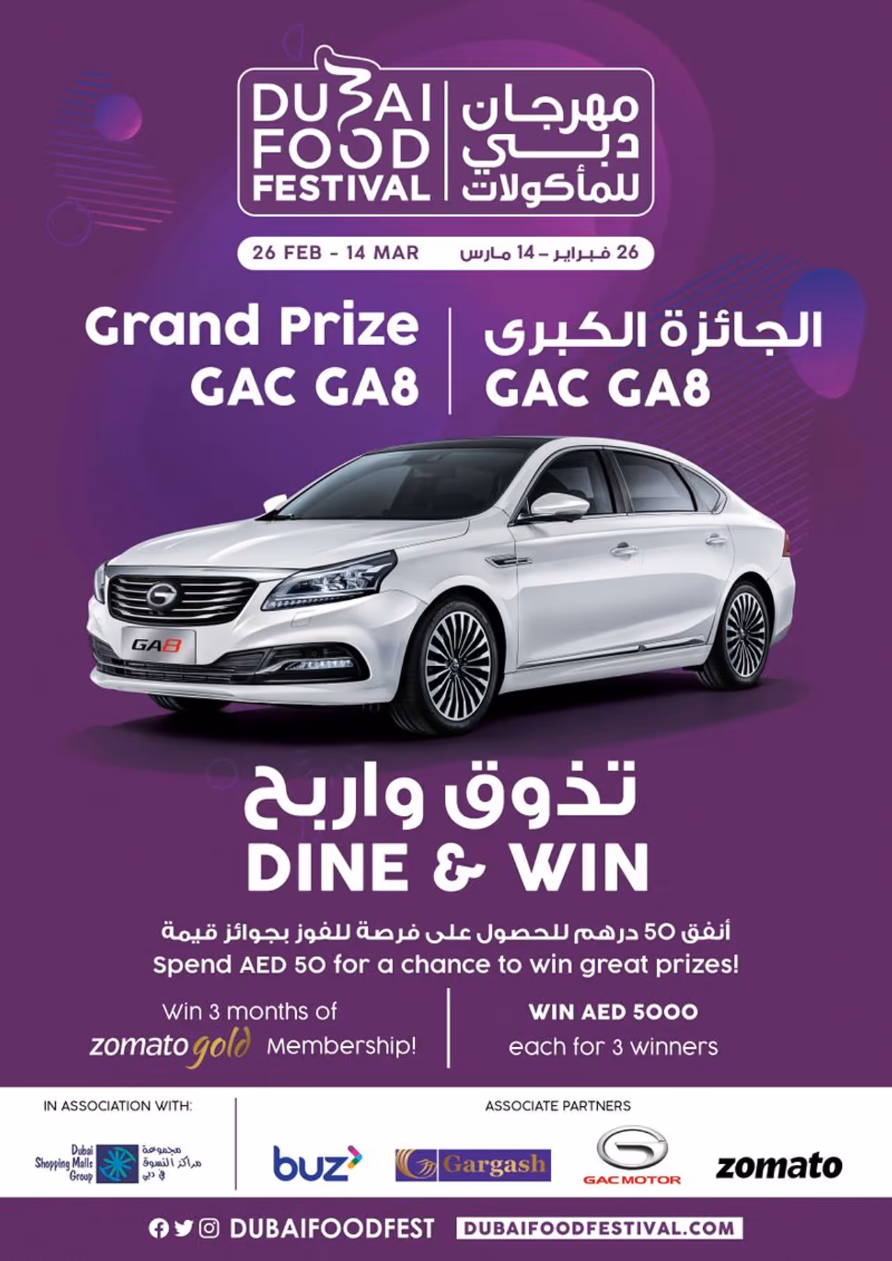 19 മാളുകളിലെ ഫുഡ് ആന്റ് ബിവറേജസ് ഔട്ട്ലെറ്റുകള്, ആയിരത്തിലധികം റസ്റ്റോറന്റുകള്, ദുബായ് വിമാനത്താവളങ്ങളിലെ തെരഞ്ഞെടുക്കപ്പെട്ട ഭക്ഷ്യശാലകള് എന്നിവയാണ് ദുബായ് ഫുഡ് ഫെസ്റ്റിവലില് പങ്കെടുക്കുന്നത്. ഫെസ്റ്റിവലില് പങ്കെടുക്കുന്ന സ്ഥാപനങ്ങളില് നിന്ന് 50 ദിര്ഹത്തിനോ അതിനുമുകളിലോ ഭക്ഷണം കഴിക്കുന്നവരില് നിന്ന് തെരഞ്ഞെടുക്കപ്പെടുന്ന ഒരാള്ക്ക് ജിഎസി ജിഎ8 സെഡാന് മെഗാ സമ്മാനമായി ലഭിക്കും. മൂന്ന് വിജയികള്ക്ക് 5000 ദിര്ഹത്തിന്റെ ക്യാഷ് പ്രൈസ്. ഇന്സ്റ്റന്റ് സ്ക്രാച്ച് ആന്റ് വിന് സമ്മാന പദ്ധതിയിലൂടെ രണ്ട് ലക്ഷം പേര്ക്ക് സൊമാറ്റോയുടെ മൂന്ന് മാസത്തെ സൊമാറ്റോ ഗോള്ഫ് മെമ്പര്ഷിപ്പ്.