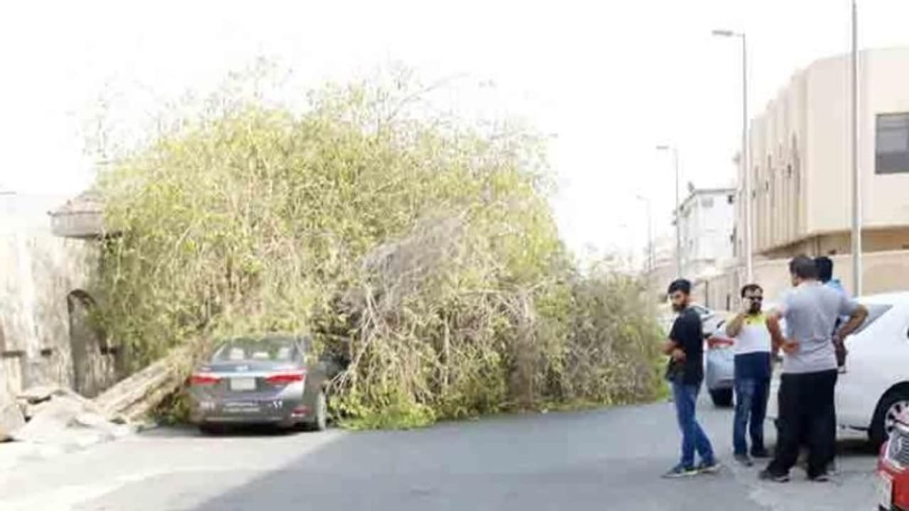 ചെങ്ങന്നൂര് സ്വദേശിയും അല്തക്വിബ് കമ്പനിയിലെ ജീവനക്കാരനുമായ ബിനുവിന്റെ കാറിന് മുകളിലാണ് മരം വീണത്. കാര് നിര്ത്തിയ ബിനു ഭക്ഷണം കഴിക്കാനായി പുറത്തിറങ്ങി നിമിഷങ്ങള്ക്കുള്ളിലായിരുന്നു സംഭവം.