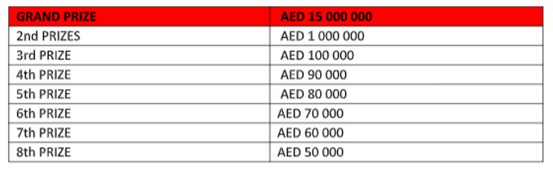 ഇത്തവണ ഫന്റാസ്റ്റിക് 15 മില്യന് നറുക്കെടുപ്പില് ഒന്നാം സമ്മാനം നേടുന്നയാളിന് 1.5 കോടി ദിര്ഹമാണ് (30 ലക്ഷത്തോളം ഇന്ത്യന് രൂപ) ലഭിക്കുക. ഇത്തവണ മാത്രം രണ്ടാം സമ്മാനം നേടുന്നയാളിനും 10 ലക്ഷം ദിര്ഹം (രണ്ട് കോടിയോളം ഇന്ത്യന് രൂപ) ലഭിക്കും.