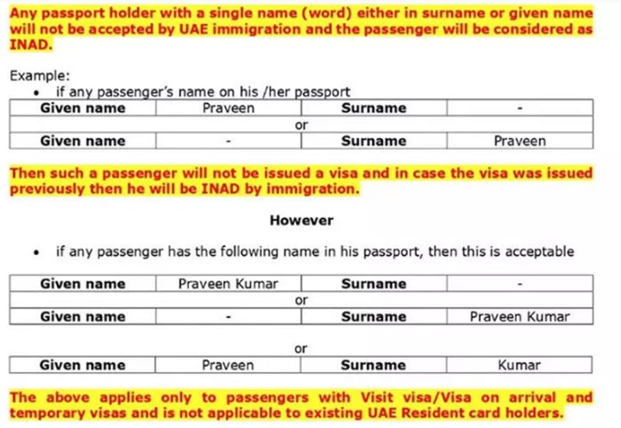 പാസ്പോര്ട്ടില് സിങ്കിള് നെയിം (ഒറ്റപ്പേര്) മാത്രമുള്ളവര്ക്ക് യുഎഇയില് സന്ദര്ശക-ടൂറിസ്റ്റ് വിസ അനുവദിക്കില്ലെന്ന് യുഎഇ നാഷണല് അഡ്വാന്സ് ഇന്ഫര്മേഷന് സെന്റര് (എന്എഐസി) അറിയിച്ചിരുന്നു. പാസ്പോര്ട്ടില് ഗിവണ് നെയിമോ സര് നെയിമോ മാത്രം നല്കിയവര്ക്കാണ് തിരിച്ചടിയാകുന്നത്. ഗിവണ് നെയിം എഴുതി സര് നെയിമിന്റെ സ്ഥാനത്ത് ഒന്നും എഴുതിയില്ലെങ്കിലോ സര് നെയിം എഴുതി ഗിവണ് നെയിം ഒന്നും എഴുതാതിരുന്നാലോ യുഎഇ പ്രവേശനം സാധ്യമാകില്ലെന്ന് എയര് ഇന്ത്യ, എയര് ഇന്ത്യ എക്സ്പ്രസ്, ഇന്ഡിഗോ എന്നീ വിമാവ കമ്പനികള് അറിയിച്ചിട്ടുണ്ട്.