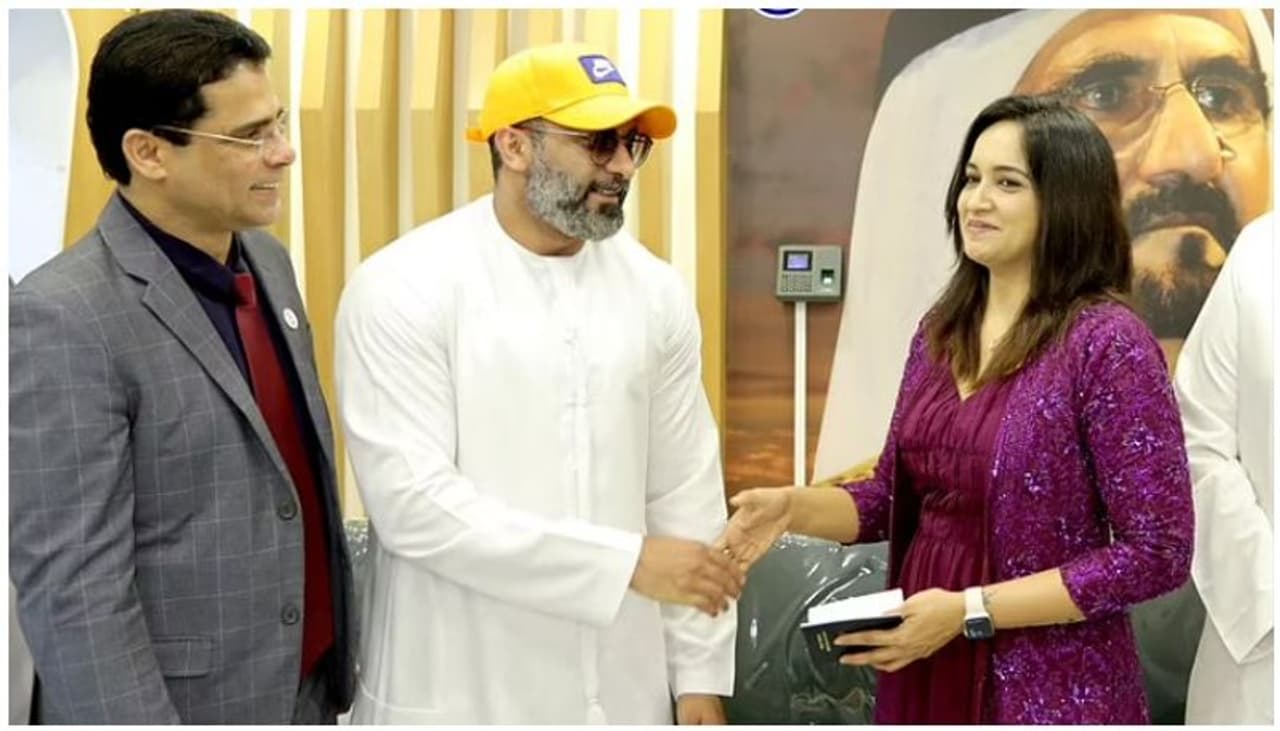 ഇസിഎച്ച് ആസ്ഥാനത്ത് നടന്ന ചടങ്ങളില് ദുബൈയിലെ താമസ കുടിയേറ്റ വകുപ്പ് ഉദ്യോഗസ്ഥന് അദ്നാന് മൂസ ബലൂഷിയില് നിന്ന് ലെന ഗോള്ഡന് വിസ ഏറ്റുവാങ്ങി.