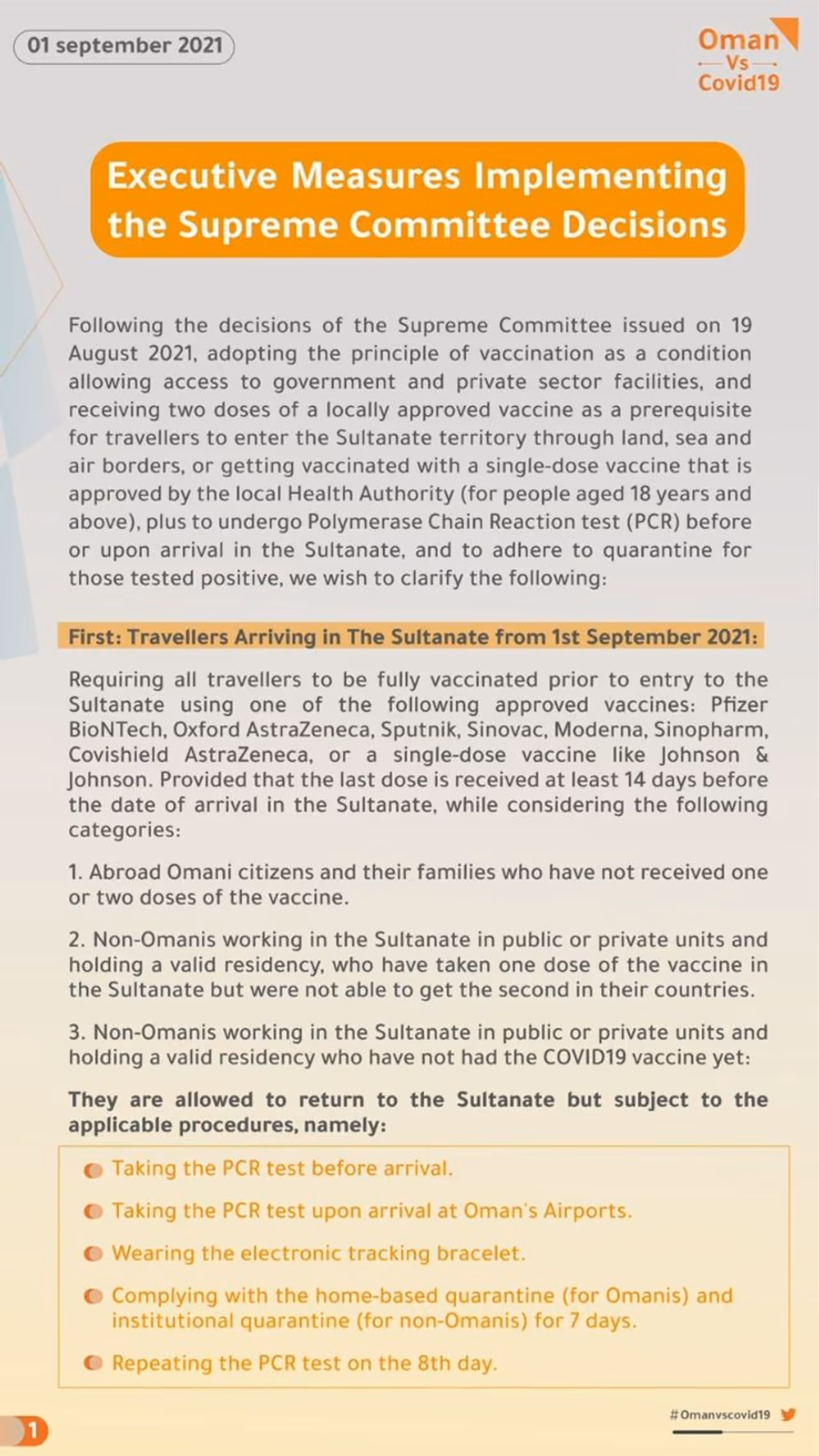 ഒമാന് സ്വദേശികള്, സാധുതയുള്ള റസിഡന്സ് വിസയിലുള്ള വിദേശികള് എന്നിവര്ക്ക് വാക്സിനെടുക്കാതെയും പ്രവേശനം അനുവദിക്കും.