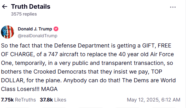 വാഷിങ്ടൺ: യുഎസ് പ്രസിഡന്റ് ഡോണാൾഡ് ട്രംപിന് ഖത്തര് ആഢംബര ജെറ്റ് സമ്മാനമായി നല്കുന്നുവെന്ന റിപ്പോര്ട്ടുകള് പുറത്തുവന്നതിന് പിന്നാലെ ഉണ്ടായ വിവാദത്തില് നിശബ്ദത ഭേദിച്ച് ട്രംപ്. ഖത്തറിന്റെ സമ്മാനവുമായി ബന്ധപ്പെട്ട വിവാദത്തിൽ പ്രതികരിച്ച ട്രംപ്, സുതാര്യവും ചെലവ് കുറഞ്ഞതുമായ ഒരു ക്രമീകരണത്തിൽ ഡെമോക്രാറ്റുകൾ പ്രകോപിതരാണെന്ന് ആരോപിച്ചു. 'ട്രൂത്ത് സോഷ്യൽ' പ്ലാറ്റ്ഫോമിലൂടെ പ്രതികരണം നടത്തിയത്.
