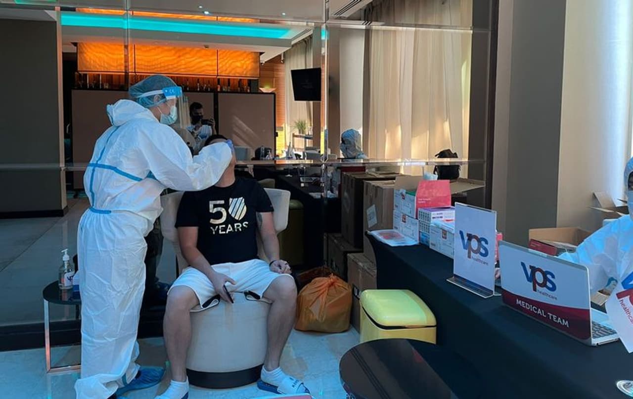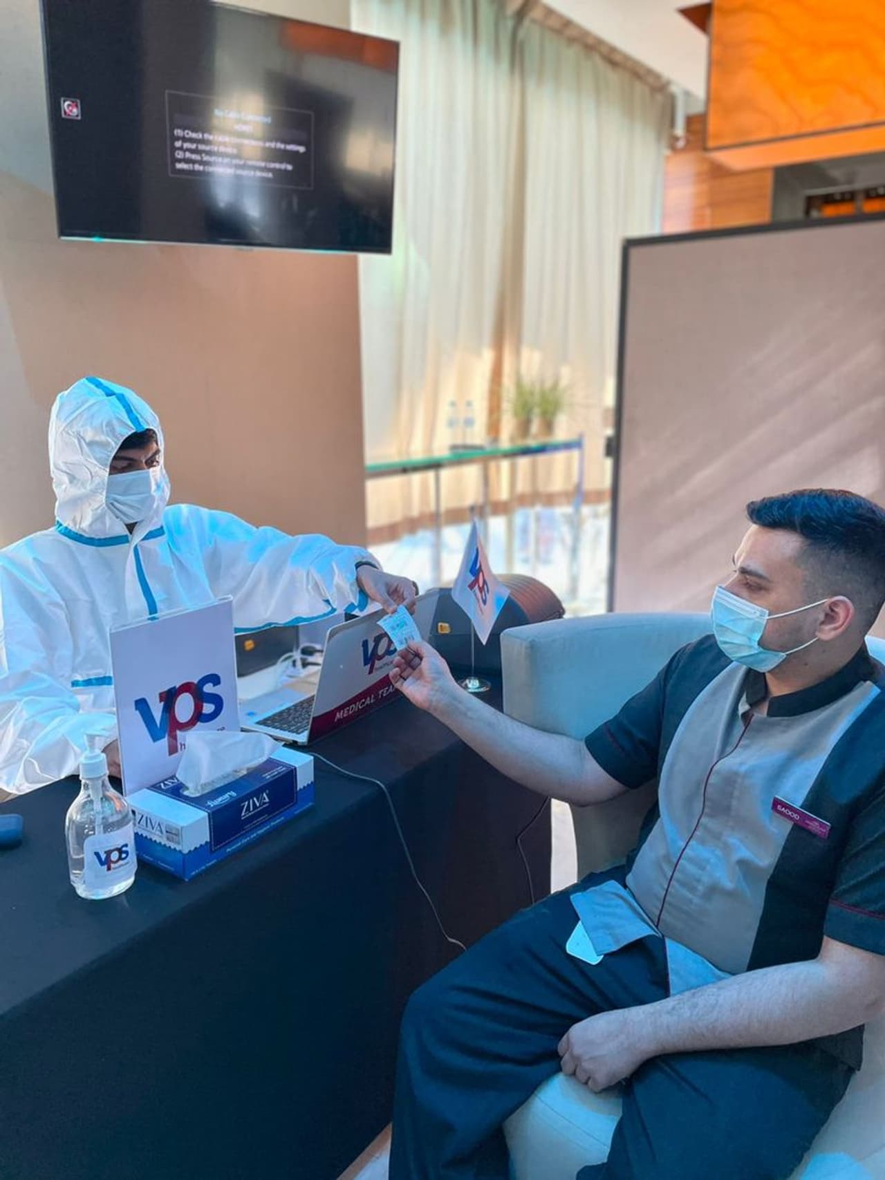 (ഫോട്ടോ: ടി 20 ലോകകപ്പ് ക്രിക്കറ്റിന്റെ ബയോ ബബ്ള് കാക്കുന്ന വിപിഎസ് മെഡിക്കല് സംഘത്തിലെ അംഗങ്ങള് ക്രിക്കറ്റ് താരങ്ങള് താമസിക്കുന്ന ഹോട്ടലുകളിലെ ജീവനക്കാരെ പരിശോധനയ്ക്ക് വിധേയമാക്കുന്നു).