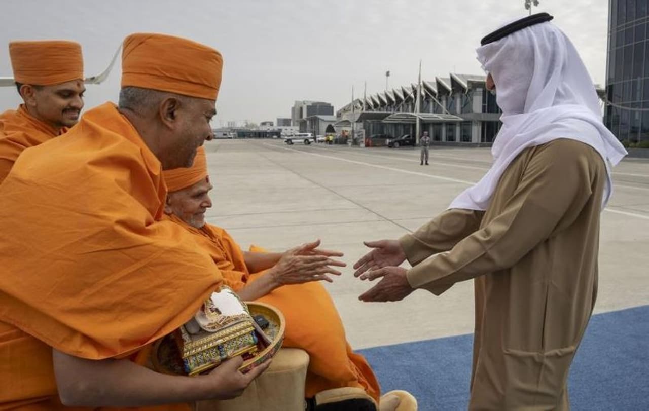 'യുഎഇയിലേക്ക് സ്വാഗതം, താങ്കളുടെ സാന്നിധ്യത്താല് ഞങ്ങളുടെ രാജ്യം അനുഗ്രഹീതമായിരിക്കുന്നു. താങ്കളുടെ ദയ ഞങ്ങളെ സ്പര്ശിച്ചു. താങ്കളുടെ പ്രാര്ത്ഥന ഞങ്ങള് അനുഭവിക്കുന്നു'- ശൈഖ് നഹ്യാന് പറഞ്ഞു. നിങ്ങളുടെ സ്നേഹവും ആദരവും സ്പര്ശിച്ചെന്നും യുഎഇയിലെ നേതാക്കള് മികച്ചവരും നല്ലവരും വിശാല ഹൃദയമുള്ളവരുമാണെന്നും സ്വാമി മഹാരാജ് മറുപടി നല്കി.