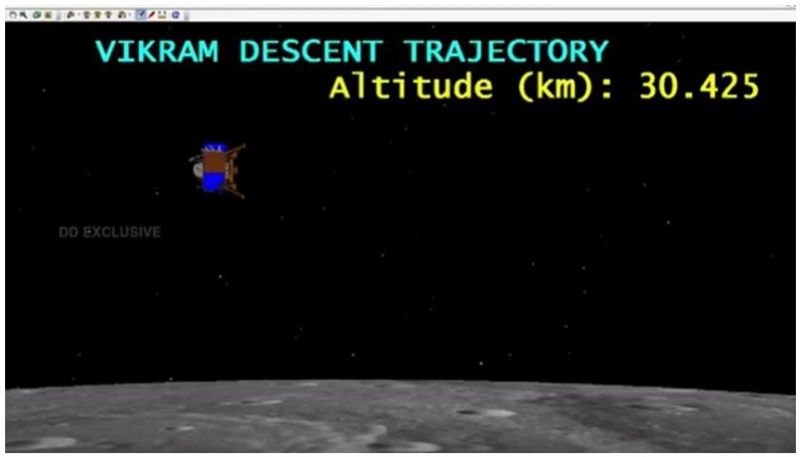 പുലർച്ചെ കൃത്യം 1.39 - ചന്ദ്രയാൻ വിക്രം ലാൻഡർ പതുക്കെ താഴേയ്ക്കിറങ്ങുന്നതിന്റെ ഗ്രാഫിക്കൽ റെപ്രസന്റേഷൻ സ്ക്രീനിൽ തെളിഞ്ഞു. ഇപ്പോൾ ചന്ദ്രോപരിതലത്തിൽ നിന്ന് ഉയരും 30.425 കിലോമീറ്റർ.