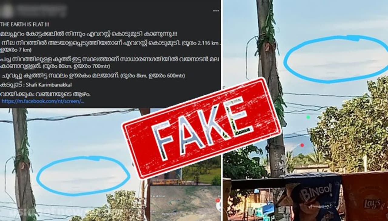 മലപ്പുറം: ഈ അടുത്ത ദിവസം ഫേസ്ബുക്കിൽ (Facebook) പ്രത്യക്ഷപ്പെട്ടൊരു പോസ്റ്റാണ്. " മലപ്പുറം കോട്ടക്കലിൽ നിന്നും എവറസ്റ്റ് കൊടുമുടി (Everest) കാണുന്നു.!!! " ശരിക്കും ഈ മലപ്പുറത്തൂന്ന് നോക്കിയാ രണ്ടായിരം കിലോമീറ്റർ ദൂരെയുള്ള എവറസ്റ്റ് കാണാൻ പറ്റുമോയെന്ന് ചോദിച്ചാൽ ഇല്ല എന്ന് മാത്രമേ പറയാനുള്ളൂ. ഒരു അറിവില്ലാ പോസ്റ്റായി തള്ളിക്കളയാവുന്നതല്ല ഇത്, കാണുന്നത് എവറസ്റ്റാണെന്ന് ചുമ്മാ പറയുക മാത്രമല്ല, ഭൂമി പരന്നിട്ടാണെന്നുള്ളതിന്റെ തെളിവാണ് ഇതെന്നും ഇയാൾ അവകാശപ്പെടുന്നു.