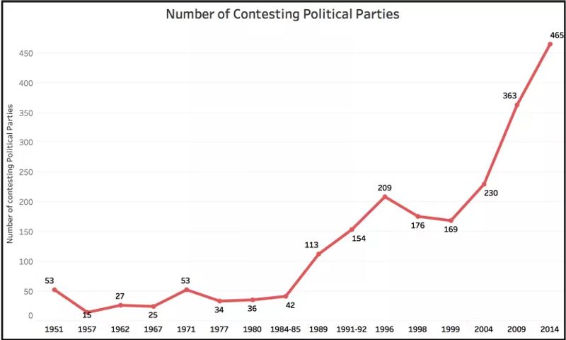 1951 -ൽ ആദ്യത്തെ തെരഞ്ഞെടുപ്പ് നടന്നപ്പോൾ ആകെയുണ്ടായിരുന്ന ലോക്സഭാ സീറ്റുകൾ 489. 53 പാർട്ടികളും. അന്നുണ്ടായിരുന്ന 36 കോടി ജനങ്ങളിൽ വോട്ടവകാശമുള്ള ( അന്ന് 21 വയസ്സായിരുന്നു വോട്ടുചെയ്യാൻ വേണ്ടുന്ന ചുരുങ്ങിയ പ്രായം, പിന്നെയാണ് അത് 18 ആയി കുറച്ചത് ) ജനങ്ങൾ പതിനേഴുകോടിയോളം ആയിരുന്നു. അന്ന് രാജ്യത്ത് രജിസ്റ്റർ ചെയ്യപ്പെട്ടിരുന്ന 53 പാർട്ടികളിലും കൂടി, ആകെക്കൂടി തെരഞ്ഞെടുപ്പിൽ മത്സരിക്കാനുണ്ടായിരുന്നത് 1849 സ്ഥാനാർത്ഥികളായിരുന്നു.