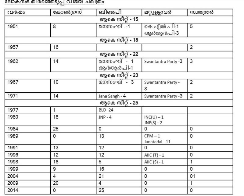 1962 വരെ കോൺഗ്രസ് സംസ്ഥാനത്ത് അജയ്യ ശക്തിയായിരുന്നു. 1967ൽ ഭൈരോൺസിങ് ഷെഖാവതിന്റെ നേതൃത്വത്തിൽ ജനസംഘും രാജമാതാ ഗായത്രിദേവിയുടെ നേതൃത്വത്തിൽ സ്വതന്ത്രതാ പാർട്ടിയും ചേർന്ന സഖ്യത്തിന് ഭൂരിപക്ഷം ലഭിച്ചെങ്കിലും സർക്കാർ രൂപീകരിക്കാൻ കഴിഞ്ഞില്ല. 1972ൽ കോൺഗ്രസിന് വൻ ഭൂരിപക്ഷം ലഭിച്ചു. അടിയന്തിരാവസ്ഥക്കാലത്ത് ഭൈറോൺസിങ് ഷെഖാവത്തും ഗായത്രിദേവിയും ജയിലിലായി. 1977ലെ തിരഞ്ഞെടുപ്പിൽ 200ൽ 151 സീറ്റ് നേടി ജനത പാർട്ടി അധികാരത്തിലെത്തി.