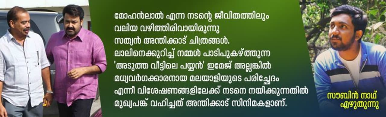 ഈ വീക്ഷണകോണിലൂടെ വായിച്ചാൽ, മോഹൻലാൽ എന്ന നടന്റെ ജീവിതത്തിലും വലിയ വഴിത്തിരിവായിരുന്നു സത്യന് അന്തിക്കാട് ചിത്രങ്ങള്. ലാലിനെക്കുറിച്ച് നമ്മൾ പാടിപുകഴ്ത്തുന്ന 'അടുത്ത വീട്ടിലെ പയ്യൻ' ഇമേജ് അല്ലങ്കിൽ മധ്യവർഗക്കാരനായ മലയാളിയുടെ പരിച്ഛേദം എന്നീ വിശേഷണങ്ങളിലേക്ക് നടനെ നയിക്കുന്നതിൽ മുഖ്യപങ്ക് വഹിച്ചത് അന്തിക്കാട് സിനിമകളാണ്. മോഹൻലാലിൽ മറഞ്ഞിരുന്നിരുന്ന സാധാരണക്കാരനായ, കുറവുകളും പരിമിതികളുമുള്ള 'മിഡിൽ ക്ലാസ്സ്' മലയാളി യുവാവിനെ സത്യൻ അന്തിക്കാട് കണ്ടെടുക്കുകയായിരുന്നു. ആ നടന്റെ ചലച്ചിത്രജീവിതത്തെ 'ടി. പി. ബാലഗോപാലൻ MA'ക്ക് മുൻപും പിൻപും എന്ന് അടയാളപ്പെടുത്തുന്നതില് അത്ര അതിശയോക്തി ഉണ്ടാവില്ല. അത് ആ ചിത്രംകൊണ്ട് മാത്രമല്ല. 1986, മോഹൻലാൽ എന്ന നടന്റെ ജീവിതത്തിലെ സുപ്രധാന വർഷമാണ്. 'പഞ്ചാഗ്നി', 'മഴപെയ്യുന്നു മദ്ദളംകൊട്ടുന്നു', 'കരിയിലകാറ്റുപോലെ', 'നിന്നിഷ്ടം എന്നിഷ്ടം', 'ദൂരെ ദൂരെ ഒരു കൂടുകൂട്ടാം', 'ദേശാടനക്കിളികൾ കരയാറില്ല', 'രാജാവിന്റെ മകൻ', 'ഗാന്ധിനഗർ സെക്കന്ഡ് സ്ട്രീറ്റ്', 'നമുക്ക് പാർക്കാൻ മുന്തിരിത്തോപ്പുകൾ', 'സുഖമോ ദേവി', 'താളവട്ടം' എന്നിങ്ങനെ വ്യത്യസ്തവും മികച്ചതുമായ ചിത്രങ്ങളിൽ ലാൽ അഭിനയിച്ചത് ഈ വർഷമാണ്. പക്ഷെ, മികച്ച നടനുള്ള ആ വർഷത്തെ സംസ്ഥാന അവാർഡ് ലാലിന് നേടികൊടുത്തതാകട്ടെ 'ടി. പി. ബാലഗോപാലൻ MA'യിലെ പ്രകടനവും. ആ വർഷംതൊട്ടാണ് മോഹൻലാൽ മലയാളിയുടെ ചലച്ചിത്ര സദ്യയിലെ ഒഴിവാക്കാനാവാത്ത വിഭവമായതും. താൻ അനുഭവിച്ചിരുന്ന ഒരുതരം സ്വത്വപ്രതിസന്ധി ആ നടൻ സത്യൻ അന്തിക്കാടിലൂടെ മറികടന്നു എന്നുവേണം വായിച്ചെടുക്കാൻ.