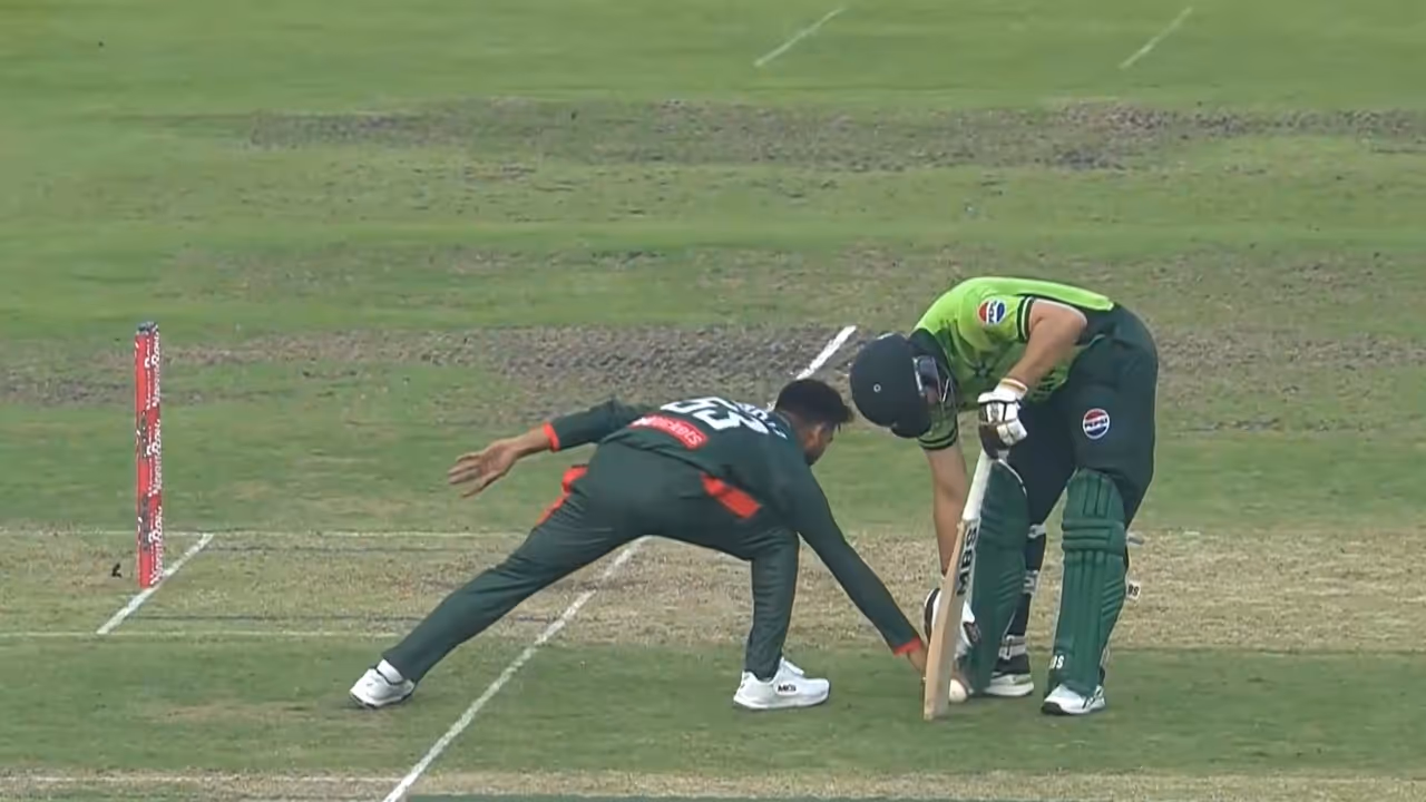 ഓഫ് സ്റ്റമ്പ് ലൈനിലെത്തിയ ലെങ്ത് ബോള് ലോങ് ഓണിലേക്ക് തിരിച്ചുവിടാനുള്ള റിസ്വാന്റെ ശ്രമം. നോണ് സ്ട്രൈക്കര് എൻഡ് വിട്ടിറങ്ങിയ സല്മാൻ അലി അഗയുടെ നേര്ക്കാണ് പന്തെത്തുന്നത്, മെഹിദിയുടെ വലതുവശത്തേക്ക്. സല്മാന്റെ പിന്നില് നിന്ന് പന്തിനെ കാലുപയോഗിച്ച് തടയുകയാണ് മെഹിദി. ഇരുവരുടേയും ശരീരങ്ങള് ചെറുതായൊന്ന് ഇവിടെ കൂട്ടിയിടിക്കുകയും ചെയ്തു.