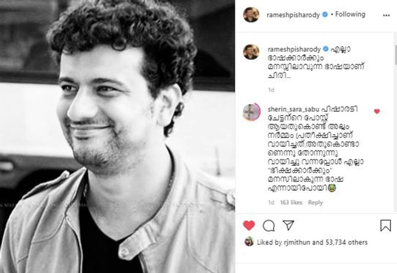 ഒന്നും കൊടുത്തില്ലെങ്കിലും അവര്ക്ക് ഒരു ചിരി കൊടുത്താല് മതിയെന്നാണ് കമന്റിന് പിഷാരടി റിപ്ലൈ ചെയ്തിരിക്കുന്നത്. എല്ലായിപ്പോഴും വാക്കുകള്കൊണ്ടും ആഖ്യാനംകൊണ്ടും ആളുകളെ ചിരിപ്പിക്കുന്ന പിഷാരടിയുടെ പോസ്റ്റ് ഇത്തരത്തിലേ ആള്ക്കാര്ക്ക് വായിക്കാന് കഴിയൂവന്നതാണ് തമാശ. ഏതായാലും പോസ്റ്റിനെക്കാള് തരംഗമായിരിക്കുന്നത് കമന്റാണ്. ഷെറിന് സാറാ സാബു എന്നയാളാണ് കമന്റ് ചെയ്തിരിക്കുന്നത്.