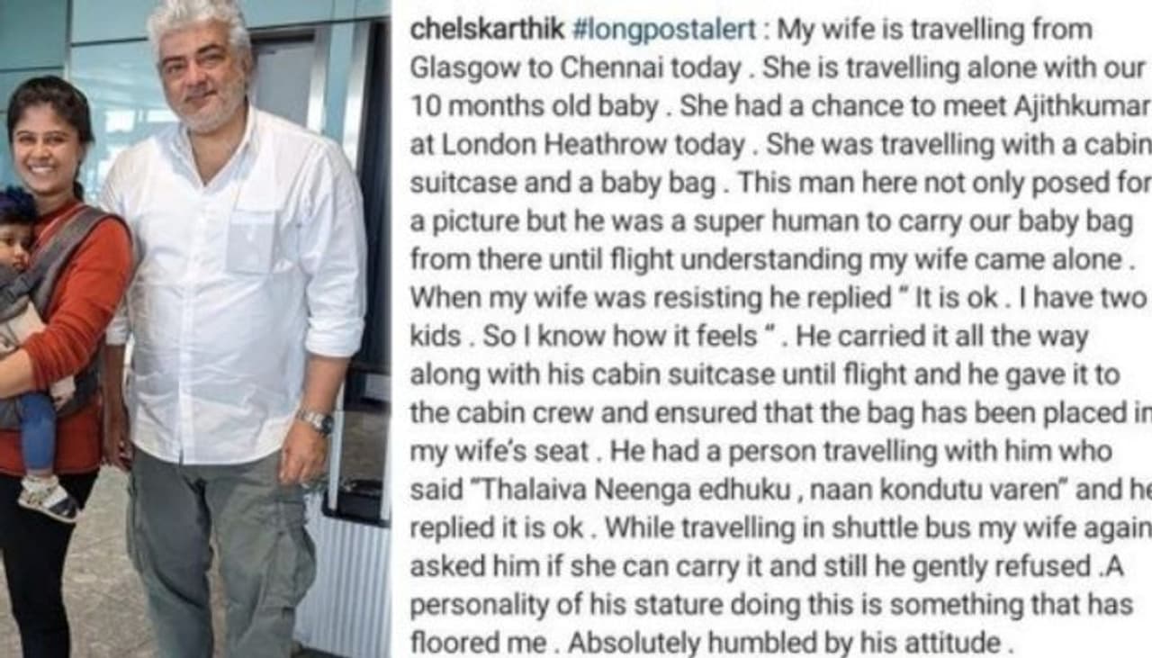 ‘എന്റെ ഭാര്യ ഗ്ലാസ്ഗോയിൽ നിന്ന് ചെന്നൈയിലേക്ക് പോവുകയായിരുന്നു. 10 മാസം പ്രായമുള്ള കുഞ്ഞിനൊപ്പം അവൾ തനിച്ചായിരുന്നു. ഇതിനിടയിൽ നടൻ അജിത് കുമാറിനെ കാണാൻ അവസരം ലഭിച്ചു. സ്യൂട്ട്കേസും കുട്ടിയുമായി അവൾ താരത്തെ കാണാനെത്തി. എന്നാൽ അദ്ദേഹം ഒപ്പം ചിത്രം എടുക്കുക മാത്രമല്ല എന്റെ ഭാര്യയെ സഹായിക്കുകയും ചെയ്തു. അദ്ദേഹം ഞങ്ങളുടെ സ്യൂട്ട്കേസ് പിടിച്ചു. ഭാര്യ നിരവധി തവണ വേണ്ടെന്ന് പറഞ്ഞെങ്കിലും എനിക്കും രണ്ടു കുട്ടികളുണ്ട്. എനിക്ക് മനസ്സിലാക്കാൻ കഴിയും ഈ ബുദ്ധിമുട്ടുകളെന്നാണ് അദ്ദേഹം പറഞ്ഞത് ‘, എന്നാണ് യുവതിയുടെ ഭർത്താവ് കുറിപ്പിൽ പറയുന്നത്. പിന്നാലെ അജിത്തിന്റെ പ്രവർത്തിയെ അഭിനന്ദിച്ച് കൊണ്ട് നിരവധി പേരാണ് രംഗത്തെത്തിയത്.