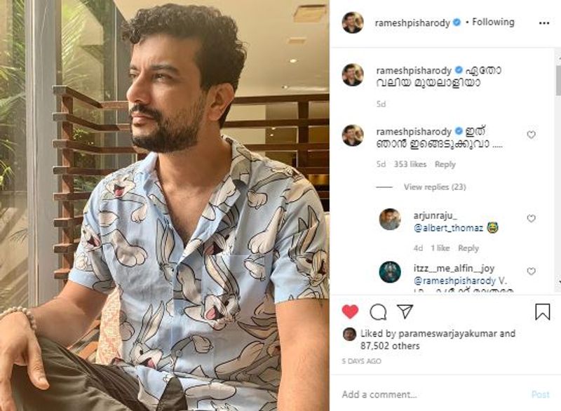 കോമഡി നമ്പറുകളിലൂടെ മലയാളി പ്രേക്ഷകരുടെ പ്രിയങ്കരനായി മാറിയ താരമാണ് രമേഷ് പിഷാരടി. സിനിമാ വിശേഷങ്ങളും മറ്റ് രസകരമായ അനുഭവങ്ങളും പിഷാരടി സാമൂഹ്യമാധ്യമങ്ങളിലൂടെ പങ്കുവയ്ക്കാറുണ്ട്. ഈ ചിത്രങ്ങളും, കുറിപ്പുമെല്ലാം ഓണ്ലൈനില് തരംഗമാകാറുമുണ്ട്. പിഷാരടിയുടെ നര്മ്മബോധം സ്റ്റേജില് മാത്രമല്ല എന്നതാണ്, ആരാധകര്ക്ക് അദ്ദേഹത്തോട് പ്രത്യേക ഇഷ്ടത്തിനുകാരണം. സോഷ്യല്മീഡിയയിലും പിഷാരടി കോമഡി നമ്പറുകളുമായി ചര്ച്ചയാകാറുണ്ട്. ചിത്രങ്ങള്ക്ക് അദ്ദേഹമിടുന്ന ക്യാപ്ഷനുകളാണ് തരംഗമാകാറുള്ളത്.