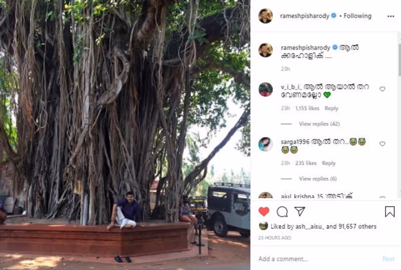 പിഷാരടിയുടെ ഏതൊരു ചിത്രം എടുത്തുനോക്കിയാലും കാണുന്ന കമന്റാണ്, ക്യാപ്ഷന് സിംഹമേ നമിച്ചുവെന്നത്. ഇപ്പോളിതാ തന്റെ 'ആല്'ക്കഹോളിക് ചിത്രമാണ് പിഷാരടി പങ്കുവച്ചരിക്കുന്നത്. വലിയൊരു ആല്മരച്ചോട്ടില് ഇരിക്കുന്ന തന്റെ ചിത്രമാണ് 'ആല്'ക്കഹോളിക്കെന്നുപറഞ്ഞ് പിഷാരടി പങ്കുവച്ചത്. ആല് ആയാല് ഒരു 'തറ' വേണമെന്നാണ് പിഷാരടിയെ കളിയാക്കിക്കൊണ്ട് ആരാധകര് കമന്റ് ചെയ്യുന്നത്.