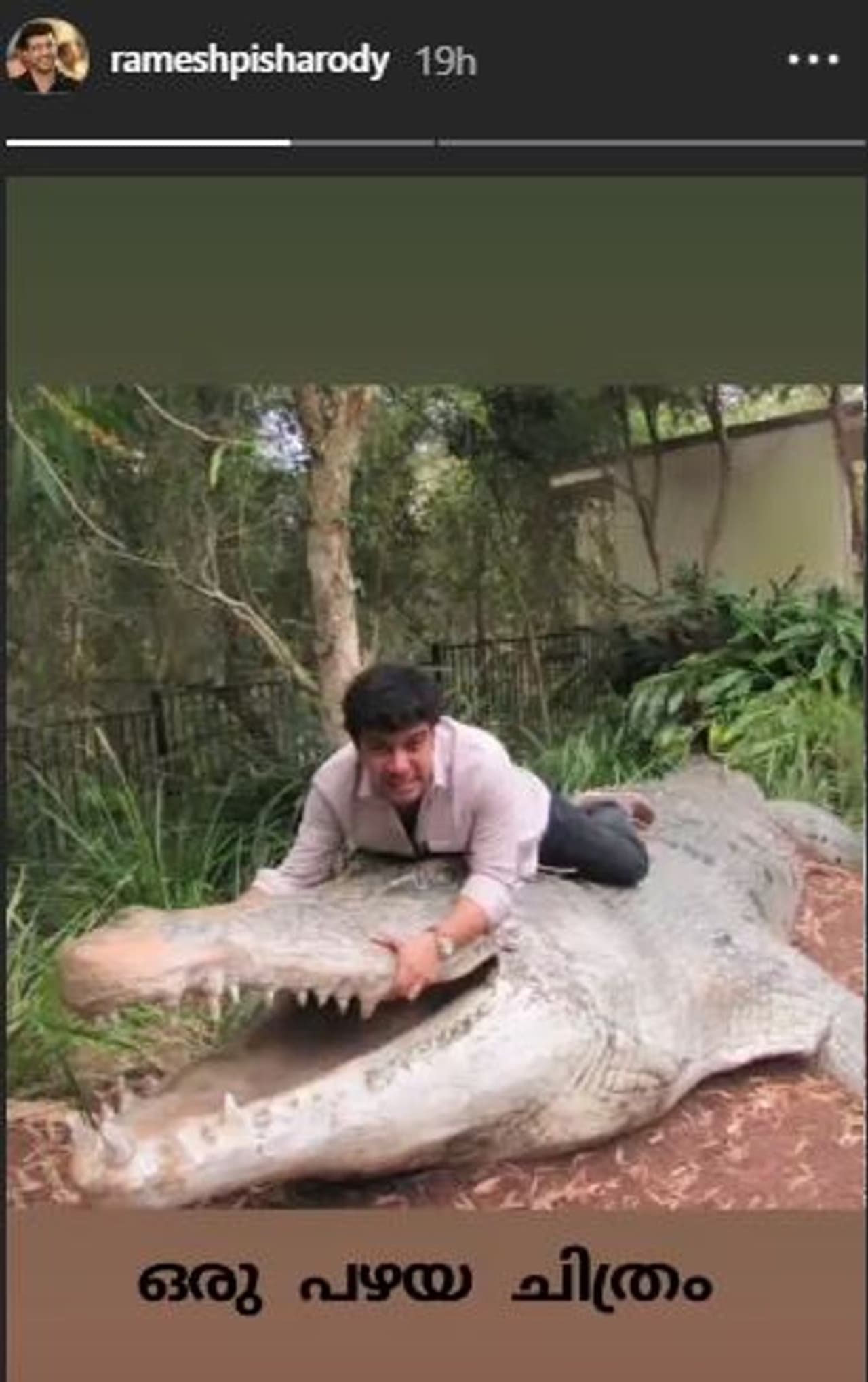 മുതലയുടെ ടാബ്ലോയുടെ മുകളില് ഇരിക്കുന്ന ചിത്രവും, മുതലയെ വാ പിളര്ത്തുന്ന ചിത്രവുമാണ് പിഷാരടി പങ്കുവച്ചത്, അതും ജോസ് പ്രകാശിന്റെ എക്കാലത്തേയും മികച്ച ഡയലോഗിനൊപ്പം