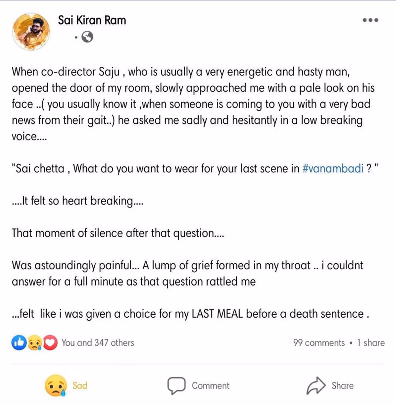 വൈകാരികമായ കുറിപ്പ്, വാനമ്പാടി പരമ്പരയെ സ്നേഹിക്കുന്നവരുടേയും ഹൃദയത്തില് ആഴത്തില്ത്തന്നെ പതിച്ചിട്ടുണ്ട്. സായ്കിരണിന്റെ ഫേസ്ബുക്ക് പോസ്റ്റിനുതാഴെ വൈകാരികമായ കമന്റുകളാണ് ആരാധകര് പങ്കുവച്ചിരിക്കുന്നത്. താരത്തെ മിസ് ചെയ്യുമെന്നും, വാനമ്പാടി ഇത്രപെട്ടന്ന് തീര്ക്കല്ലേയെന്ന റിക്വസ്റ്റുകളുമാണ് പ്രധാനമായും കമന്റുകാളായി വന്നിരിക്കുന്നത്.