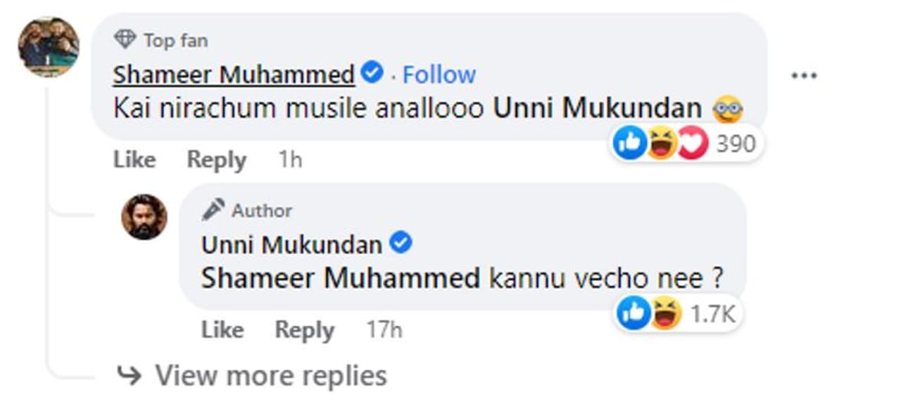 മിറർ സെൽഫി ഫോട്ടോയാണ് ഉണ്ണി മുകുന്ദൻ ഷെയർ ചെയ്തത്. 'കൈനിറച്ച് മസിലാണല്ലോ ഉണ്ണി മുകുന്ദൻ' എന്നായിരുന്നു ഒരാളുടെ കമന്റ്. ഇതിന് കണ്ണുവെച്ചോ നീ എന്നാണ് രസകരമായി ഉണ്ണി മുകുന്ദൻ നൽകിയ മറുപടി. ഞങ്ങളുടെ മസിലളിയൻ എന്നാണ് മറുപടിക്ക് താഴെ ആരാധകർ കുറിക്കുന്നത്.