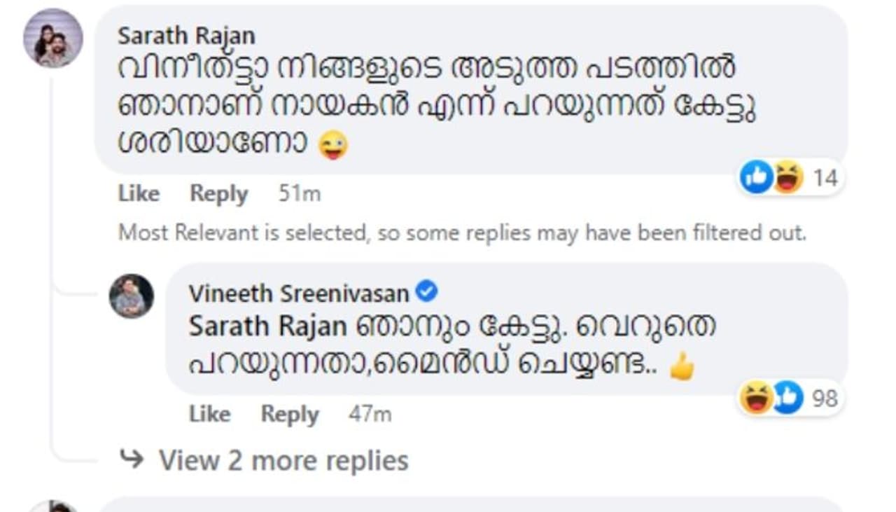 'വിനീതേട്ടാ നിങ്ങളുടെ അടുത്ത പടത്തിൽ ഞാനാണ് നായകൻ എന്ന് പറയുന്നത് കേട്ടു ശരിയാണോ', എന്നായിരുന്നു ശരത് രാജൻ എന്ന ആരാധകന്റ് കമന്റ്. ഇതിന് രസകമായ മറുപടിയാണ് വിനീത് ശ്രീനിവാസൻ നൽകിയിരിക്കുന്നത്. 'ഞാനും കേട്ടു. വെറുതെ പറയുന്നതാ,മൈൻഡ് ചെയ്യണ്ട..', എന്നായിരുന്നു വിനീതിന്റെ മറുപിടി. നിരവധി പേരാണ് താരത്തിന്റെ കമന്റിന് കയ്യടിയുമായി എത്തിയിരിക്കുന്നത്.
