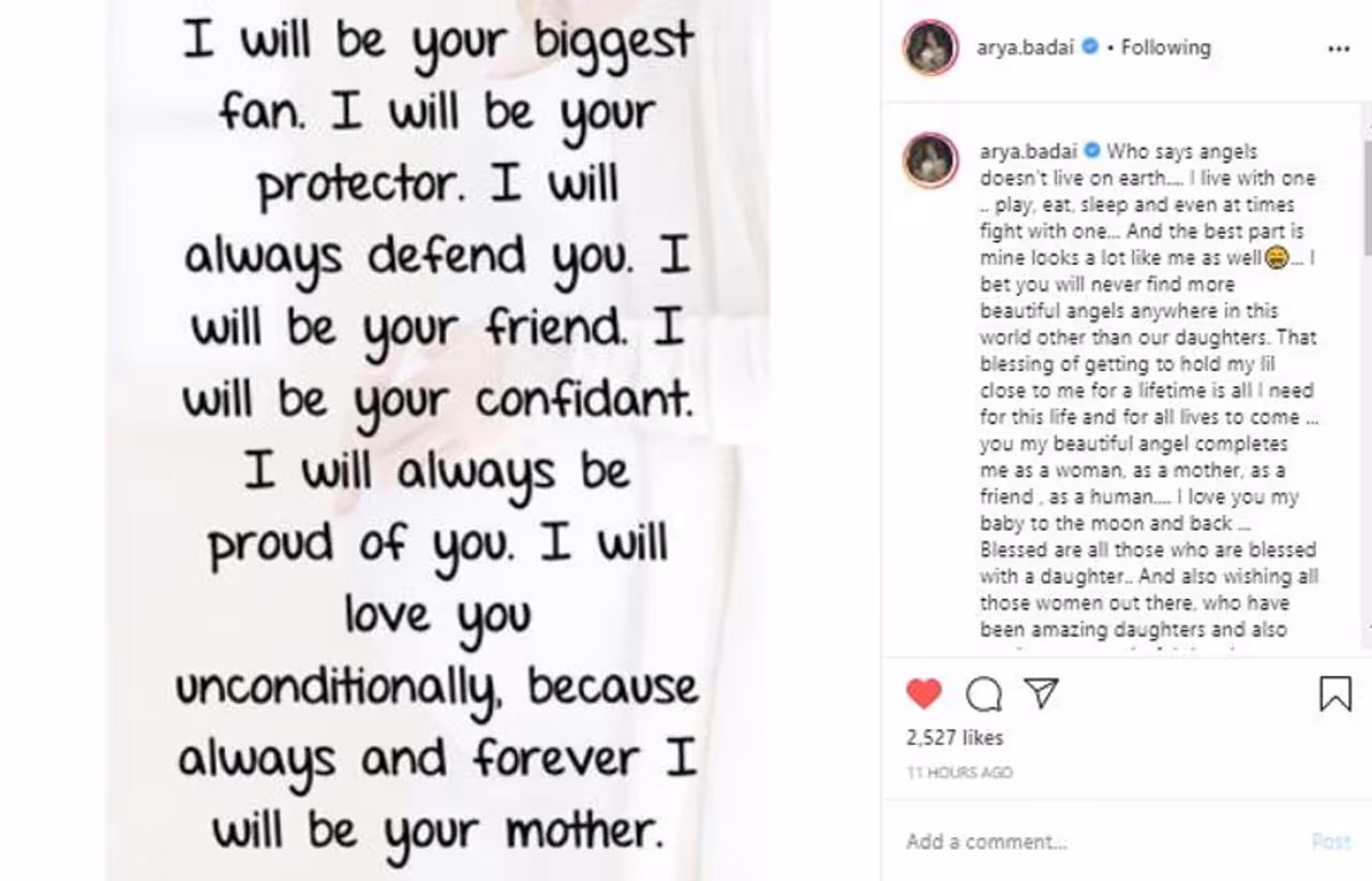 പെണ്മക്കളുടെ ദിനമായ കഴിഞ്ഞദിവസം ആര്യ പങ്കുവച്ച കുറിപ്പാണിപ്പോള് തരംഗമായിരിക്കുന്നത്. മകളെക്കുറിച്ചുള്ള കുറിപ്പില് വളരെ വൈകാരികമായാണ് ആര്യ സംസാരിക്കുന്നത്.
