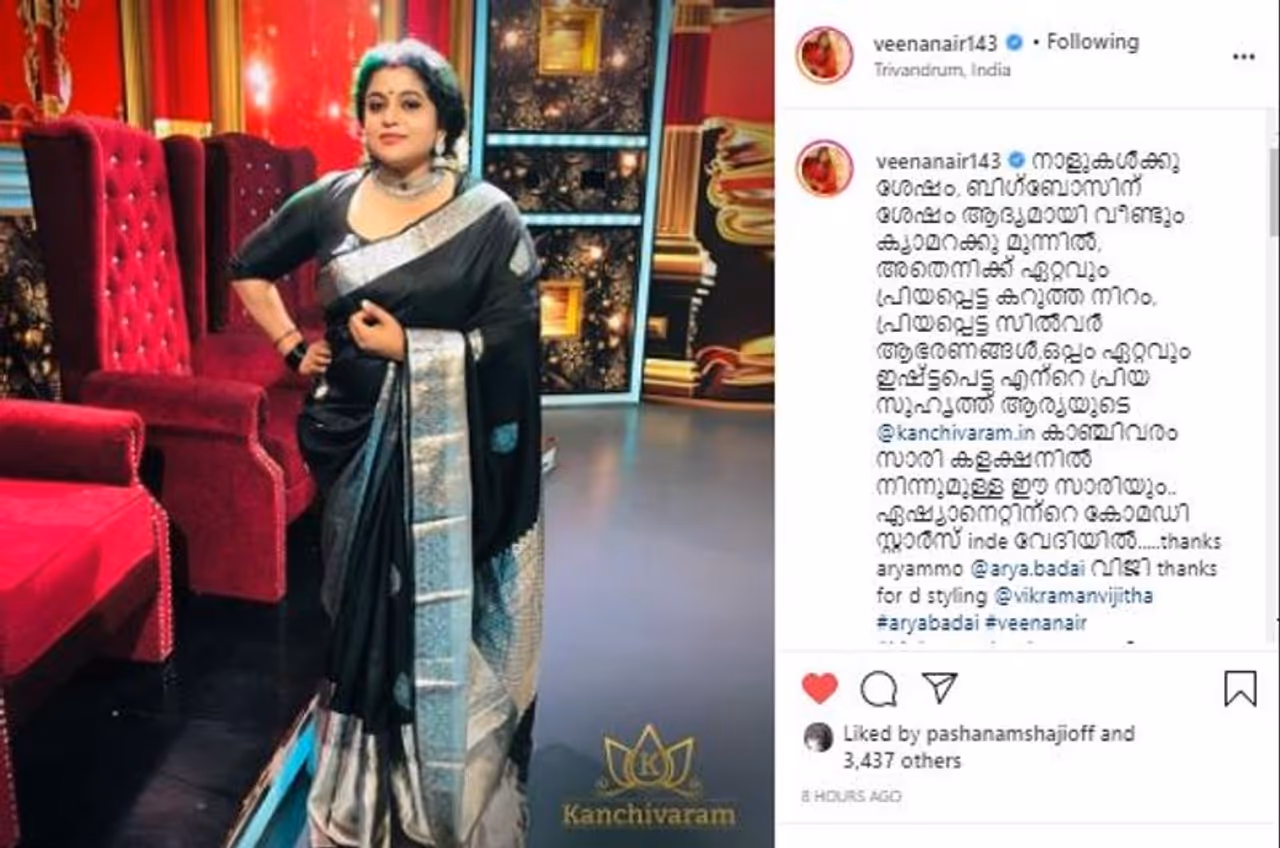 ആര്യ പുതുതായി തുടങ്ങുന്ന കാഞ്ചീവരം സാരി കളക്ഷന്സിന്റെ സാരിയിലാണ് വീണ പ്രത്യക്ഷപ്പെട്ടിരിക്കുന്നത്. നാളുകള്ക്കുശേഷം വീണയും ആര്യയും ഒന്നിച്ച് ക്യാമറയ്ക്കുമുന്നിലെത്തുന്ന സന്തോഷവും വീണ പങ്കുവച്ചിട്ടുണ്ട്.