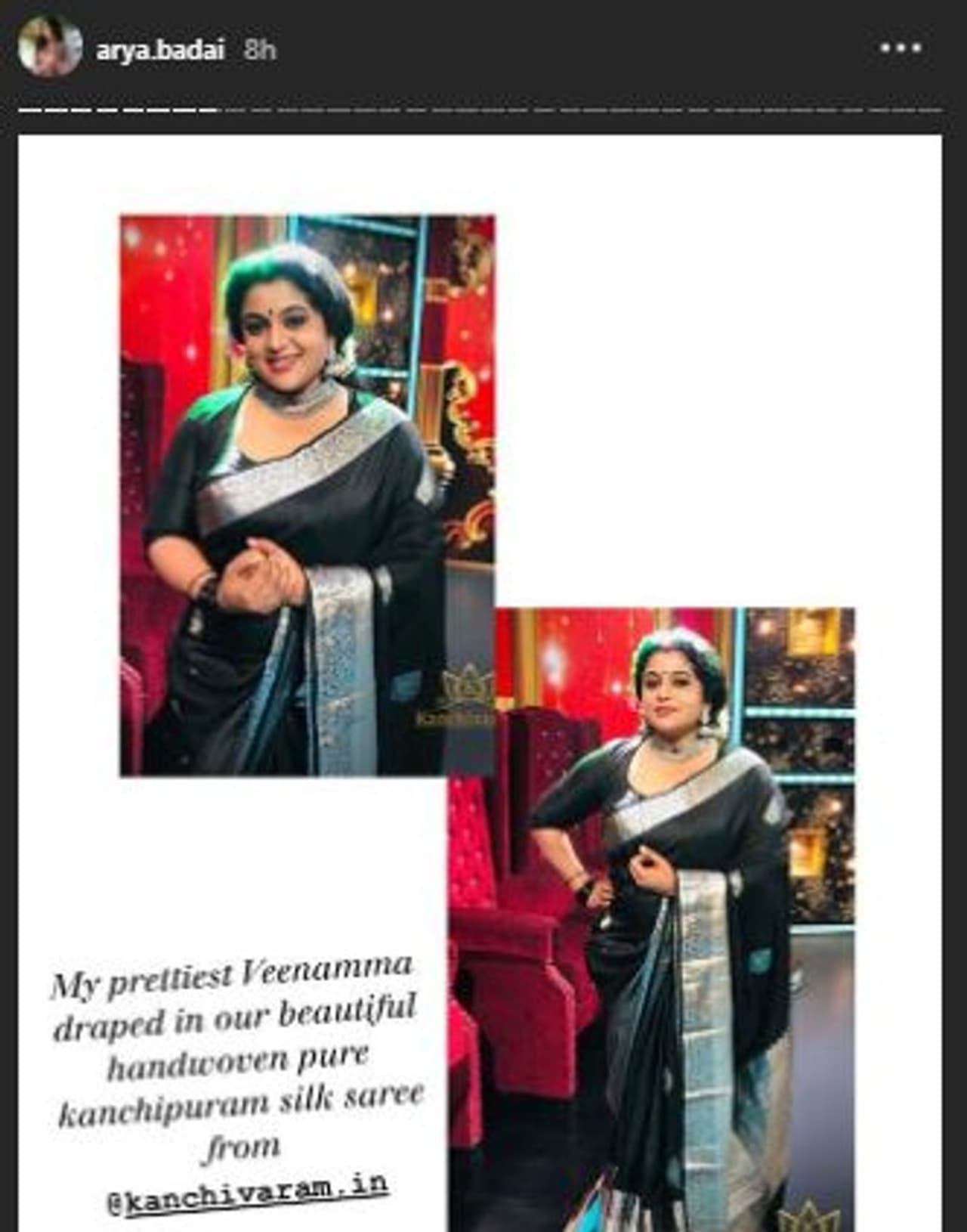 ഓപ്പണിംങിന് അധികമില്ലാത്ത ആര്യയുടെ ഏറ്റവും പുതിയ സംരഭമാണ് കാഞ്ചീവരം സാരി കളക്ഷന് എന്നത്. ഔദ്യോഗികമായി ആര്യ ഉദ്ഘാടനത്തെക്കുറിച്ച് സംസാരിച്ചിട്ടില്ലെങ്കിലും, കഴിഞ്ഞദിവസങ്ങളിലായി സാരിയുടുത്ത തന്റെ ചിത്രങ്ങള് ആര്യയും പങ്കുവയ്ക്കുന്നുണ്ട്. ഇപ്പോളിത കറുത്ത കാഞ്ചീവരത്തില് സുന്ദരിയായെത്തിയ വീണ ചിത്രത്തിനൊപ്പം ആര്യയൊന്നിച്ചുള്ള ഷോയുടെ