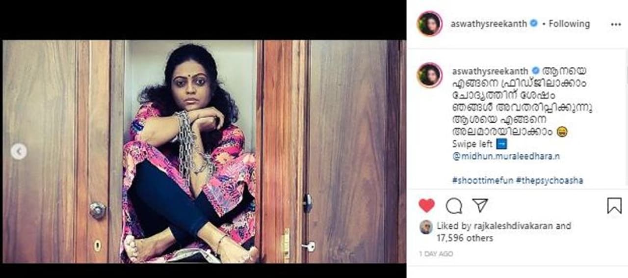 ഇപ്പോളിതാ രസകരമായൊരു ചിത്രവും, വീഡിയോയും പങ്കുവച്ചിരിക്കുകയാണ് അശ്വതി. 'ആനയെ എങ്ങനെ ഫ്രിഡ്ജിലാക്കാം എന്ന ചോദ്യത്തിനുശേഷം ഞങ്ങള് അവതരിപ്പിക്കുന്നു.. ആശയെ എങ്ങനെ അലമാരയിലാക്കാം.' എന്ന ക്യാപ്ഷനോടെയാണ് അശ്വതി ചിത്രം പങ്കുവച്ചിരിക്കുന്നത്. സീരിയലിലെ രസകരമായൊരു ഭാഗം ഷൂട്ട് ചെയ്യുന്നതിന്റെ ഭാഗമായാണ് ചിത്രം പകര്ത്തിയിരിക്കുന്നതെന്ന് വീഡിയോയില്നിന്നും വ്യക്തമാണ്. അശ്വതി കൂടാതെ മറ്റ്ചില ആളുകളും അലമാരയില് കയറിയിരിക്കുന്നതും ഫാസ്റ്റ് മോഷനായ വീഡിയോയിലുണ്ട്.