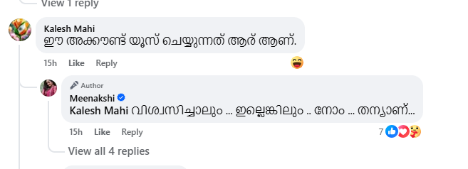 "ഈ അക്കൗണ്ട് യൂസ് ചെയ്യുന്നത് ആരാണ് ?", എന്നായിരുന്നു ഒരാളുടെ ചോദ്യം. ഇതിന് "വിശ്വസിച്ചാലും ഇല്ലെങ്കിലും നോം തന്യാണ്..", എന്നായിരുന്നു മറുപടി വന്നത്. ഒരിക്കലും ഇല്ലെന്നെല്ലാം ചോദ്യം ചോദിച്ചയാൾ കമന്റിടുന്നുണ്ട്. അവയോടൊന്നും മീനാക്ഷി പ്രതികരിച്ചിട്ടുമില്ല. എന്തായാലും മീനാക്ഷിയുടെ ക്യാപ്ഷന് ചെറുതല്ലാത്ത ആരാധകവൃന്ദം തന്നെ ഉണ്ടെന്നത് ഉറപ്പാണ്.