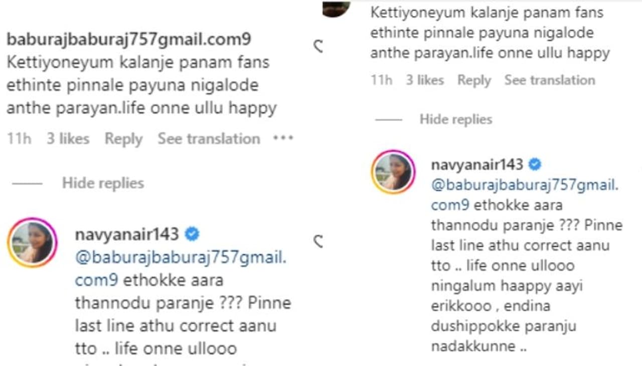 ‘കെട്ടിയോനെയും കളഞ്ഞ്, പണം, ഫാന്സ് ഇതിന്റെ പിന്നാലെ പായുന്ന നിങ്ങളോടു എന്തു പറയാന്. ലൈഫ് ഒന്നെയൊള്ളൂ ഹാപ്പി’ എന്നിങ്ങനെയായിരുന്നു ഒരാളുടെ കമന്റ്. ഇക്കാര്യം ശ്രദ്ധയിൽപ്പെട്ട ഉടനെ തന്നെ നവ്യ മറുപടിയുമായി രംഗത്തെത്തി. ‘ഇതൊക്കെ ആരാ തന്നോടു പറഞ്ഞത്? പിന്നെ അവസാനം പറഞ്ഞതു കറക്റ്റാണ്. ലൈഫ് ഒന്നെയൊള്ളൂ. ഹാപ്പിയായി ഇരിക്കൂ, എന്തിന ഇങ്ങനെ ദുഷിപ്പു പറയുന്നത്’ എന്നായിരുന്നു നവ്യയുടെ മറുപടി. നിരവധി പേരാണ് നവ്യയെ പിന്തുണച്ച് കൊണ്ട് രംഗത്തെത്തിയത്.