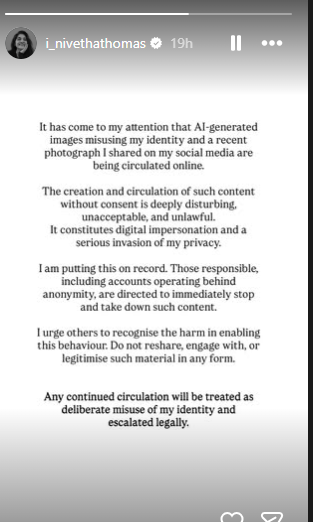 തന്റെ ചിത്രങ്ങൾ എഐ ഉപയോഗിച്ച് ദുരുപയോഗം ചെയ്യുന്നതിനെതിരെ നടി നിവേദ തോമസ് രംഗത്ത്. ഇത് സ്വകാര്യതയിലേക്കുള്ള കടന്നുകയറ്റവും അങ്ങേയറ്റം അസ്വസ്ഥതയുണ്ടാക്കുന്നതുമാണെന്ന് നടി പറഞ്ഞു.