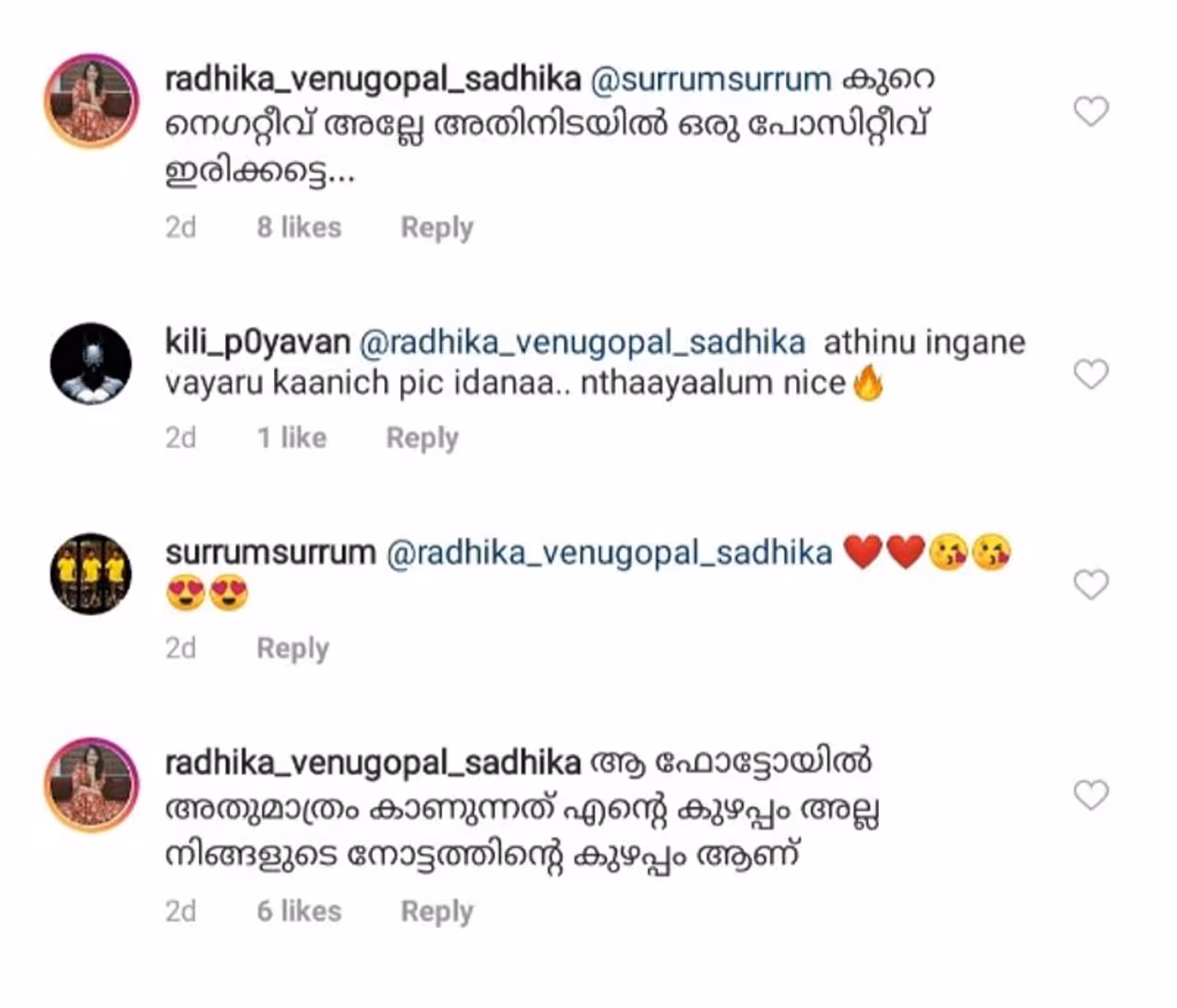 പലരും താരത്തിന് ആശംസകളുമായി എത്തുന്നുണ്ട്. പ്രതികരണങ്ങൾക്ക് മിക്കതിനും താരം മറുപടിയും നൽകിവരുന്നുണ്ട്. ചിത്രത്തന് എത്ര പ്രായമായി എന്ന് ചോദിച്ച വ്യക്തിയോട് തനിക്ക് 32 വയസ്സായി എന്നും ഉയരം ചോദിച്ച വ്യക്തിക്ക് 5.8 എന്നും താരം മറുപടി നൽകി. പിന്നാലെ ശരീരഭാഗം കാണിച്ച് ചിത്രം ഇടുന്നത് എന്തിനാണെന്ന് ചോദിച്ചയാളോട്, 'ആ ഫോട്ടോയിൽ അത് മാത്രം കാണുന്നത് എന്റെ കുഴപ്പമല്ല നിങ്ങളുടെ നോട്ടത്തിന്റെ കുഴപ്പമാണ്'- എന്നായിരുന്നു സാധികയുടെ മറുപടി.