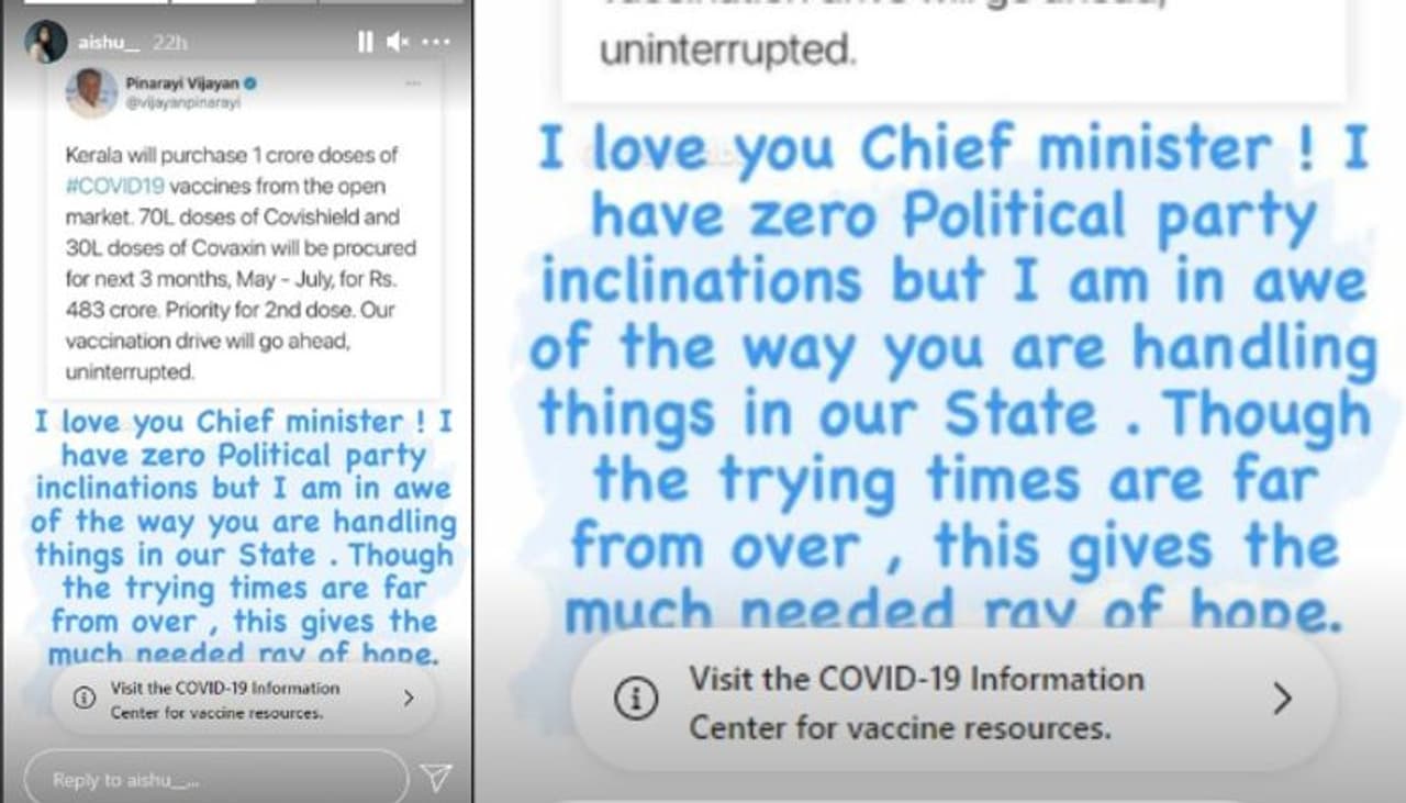 ''എനിക്ക് മുഖ്യമന്ത്രിയെ ഇഷ്ടമാണ്. പ്രത്യേകിച്ച് എനിക്ക് രാഷ്ട്രീയാഭിമുഖ്യമില്ല. നമ്മുടെ സംസ്ഥാനത്ത് താങ്കള് ചെയ്യുന്ന കാര്യങ്ങള് മികച്ചതാണ്. എന്ന് അവസാനിക്കുമെന്ന് അറിയാത്ത ഈ ദുരിതകാലത്ത് താങ്കള് ചെയ്യുന്ന കാര്യങ്ങള് പ്രതീക്ഷയുടെ കിരണം നല്കുന്നു'' എന്നാണ് ഐശ്വര്യ ഇൻസ്റ്റാഗ്രാം സ്റ്റോറിയിൽ കുറിച്ചത്.