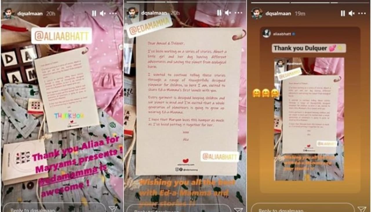 മറിയത്തിനായി ആലിയ അയച്ച സമ്മാനങ്ങളുടെ ചിത്രം ദുല്ഖര് ഇന്സ്റ്റഗ്രാം സ്റ്റോറിയിൽ പങ്കുവെച്ചിരുന്നു. മറിയത്തിന് താൻ അയച്ച സമ്മാനങ്ങൾ ഇഷ്ടമാകുമെന്ന് കരുതുന്നതായി ആലിയ കുറിപ്പിൽ എഴുതിയിട്ടുണ്ട്. ആലിയയുടെ സ്നേഹസമ്മാനത്തിനു ദുൽഖർ നന്ദി പറഞ്ഞിട്ടുണ്ട്. ദുൽഖറിന്റെ നന്ദി പറഞ്ഞുളള വാക്കുകൾ ആലിയയും തന്റെ ഇൻസ്റ്റഗ്രാം സ്റ്റോറിയാക്കിയിരുന്നു.