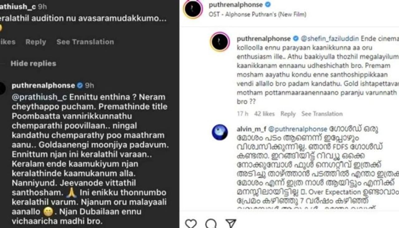 ഏപ്രില് 3 മുതല് 10 വരെ ചെന്നൈയിലാണ് അല്ഫോന്സിന്റെ പുതിയ സിനിമയുടെ ഓഡിഷന് നടത്തുന്നത്. പിന്നാലെ കേരളത്തില് ഓഡിഷന് ഉണ്ടാകുമോ എന്ന ചോദ്യവുമായി ചിലര് രംഗത്തെത്തി. "എന്നിട്ട് എന്തിനാ? നേരം ചെയ്തപ്പൊ പുച്ഛം. പ്രേമത്തിന്റെ ടൈറ്റിൽ പൂമ്പാറ്റ വന്നിരിക്കുന്നത് ചെമ്പരത്തി പൂവിലാണ്. നിങ്ങൾ കണ്ടത് ചെമ്പരത്തി പൂ മാത്രമാണ്. ഗോൾഡാണെങ്കിൽ മോശം പടവും. എന്നിട്ടും ഞാൻ ഇനി കേരളത്തിൽ വരാൻ... കേരളം എന്റെ കാമുകിയും, ഞാൻ കേരളത്തിന്റെ കാമുകനും അല്ല. നന്ദിയുണ്ട്, ജീവനോടെ വിട്ടതിൽ സന്തോഷം. ഇനി എനിക്ക് തോന്നുമ്പോൾ കേരളത്തിൽ വരും. ഞാനും ഒരു മലയാളി ആണല്ലോ. ഞാൻ ദുബായിലാണ് എന്ന് വിചാരിച്ചാൽ മതി", എന്നാണ് ഇതിന് അൽഫോൺസ് നൽകിയ മറുപടി.