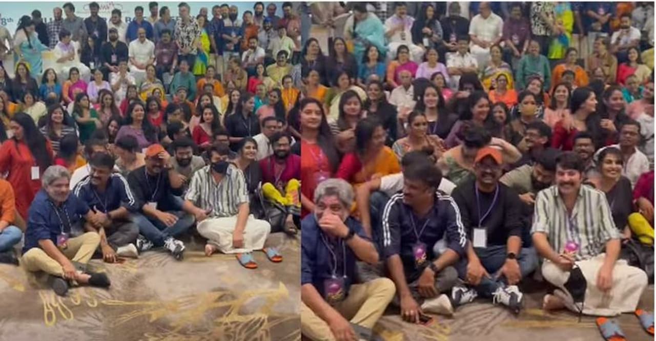 ഗ്രൂപ്പ് ഫോട്ടോ എടുക്കുന്നതിനിടെ താരങ്ങൾക്കൊപ്പം നിലത്താണ് മമ്മൂട്ടി ഇരുന്നത്.