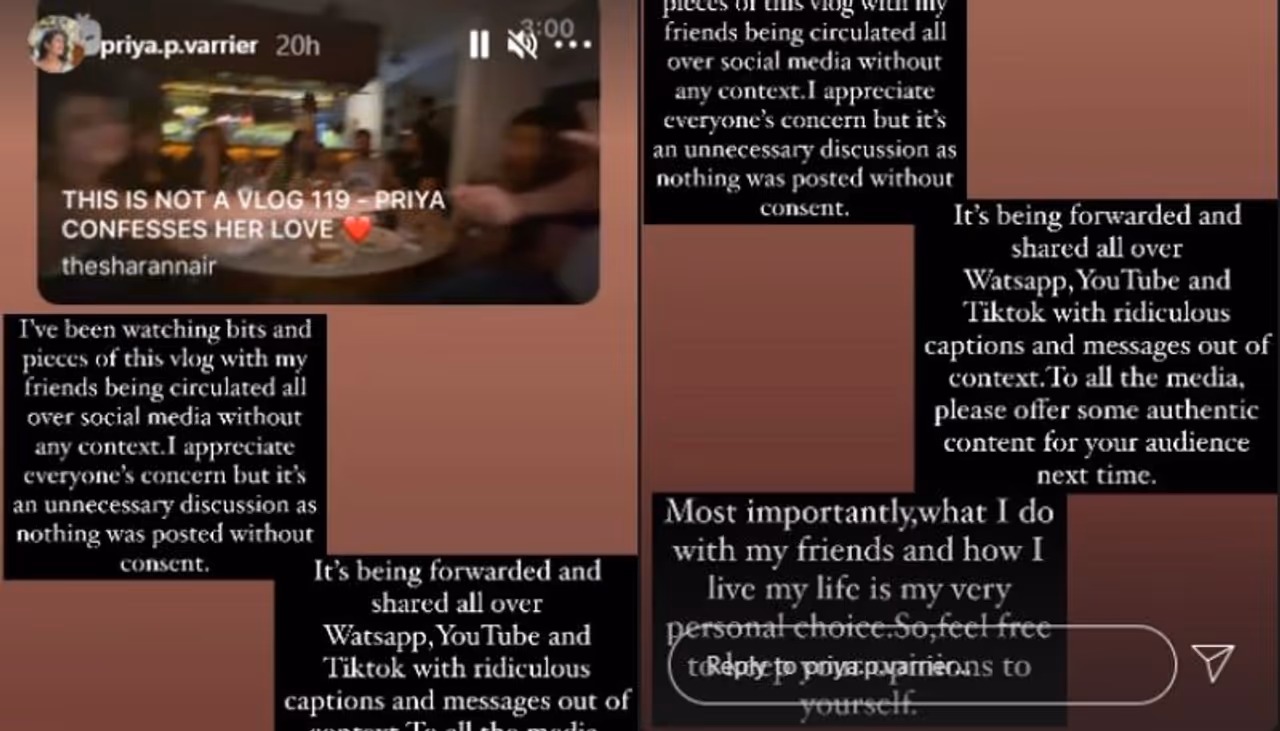 "വ്ലോഗിൽ നിന്നുള്ള ചില ക്ലിപ്പുകൾ മാത്രം മുറിച്ചുമാറ്റി സമൂഹമാധ്യമങ്ങളിൽ പല രീതിയിൽ പ്രചരിക്കുന്നത് കാണുവാനിടയായി. ഞങ്ങളുടെ ആരുടെയും അനുവാദമില്ലാതെയാണ് ഇവർ ഇത് ചെയ്തിരിക്കുന്നത്. എന്നെക്കുറിച്ചുളള നിങ്ങളുടെ കരുതൽ കാണുമ്പോൾ സന്തോഷം. എന്നാൽ ഇതിന്മേലുളള ചർച്ച തീര്ത്തും അനാവശ്യമാണ്. വളരെ മോശമായ തരത്തിലുള്ള അടിക്കുറിപ്പുകളും തലക്കെട്ടുകളും ചേർത്താണ് വിഡിയോ ക്ലിപ്പുകൾ പ്രചരിക്കുന്നത്. ഇനിയെങ്കിലും ഇതിന്റെ സത്യാവസ്ഥ മനസിലാക്കി വാർത്തകൾ നൽകൂ. കൂട്ടുകാരുമൊത്ത് എന്ത് ചെയ്യുന്നു, തന്റെ ജീവിതം എങ്ങനെ ജീവിക്കുന്നു തുടങ്ങിയവയെല്ലാം വ്യക്തിപരമായ തീരുമാനങ്ങളാണ്. അതിന്മേലുള്ള അഭിപ്രായങ്ങൾ നിങ്ങൾ നിങ്ങളിൽ തന്നെ ഒതുക്കുക", എന്നാണ് പ്രിയ ഇൻസ്റ്റാഗ്രാം സ്റ്റോറിയിൽ കുറിച്ചത്.