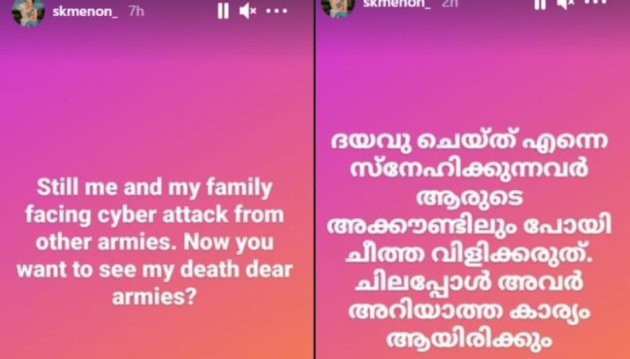 ഇൻസ്റ്റഗ്രാം സ്റ്റോറ്റസിലൂടെ തന്നെ മറ്റൊരു കുറിപ്പും സൂര്യ ഇട്ടിട്ടുണ്ട്. ദയവു ചെയ്ത് എന്നെ സ്നേഹിക്കുന്നവർ ആരുടെ അക്കൗണ്ടിലും പോയി ചീത്ത വിളിക്കരുത്. ചിലപ്പോൾ അവർ അറിയാത്ത കാര്യമായിരിക്കും എന്നാണ് സൂര്യ കുറിച്ചിരിക്കുന്നത്. ബിഗ് ബോസിൽ നിന്ന് പുറത്തുവന്നതിന് പിന്നാലെ രമ്യ പണിക്കർക്ക് നേരേയും സമാനമായ ആക്രമണം നടന്നിരുന്നു.