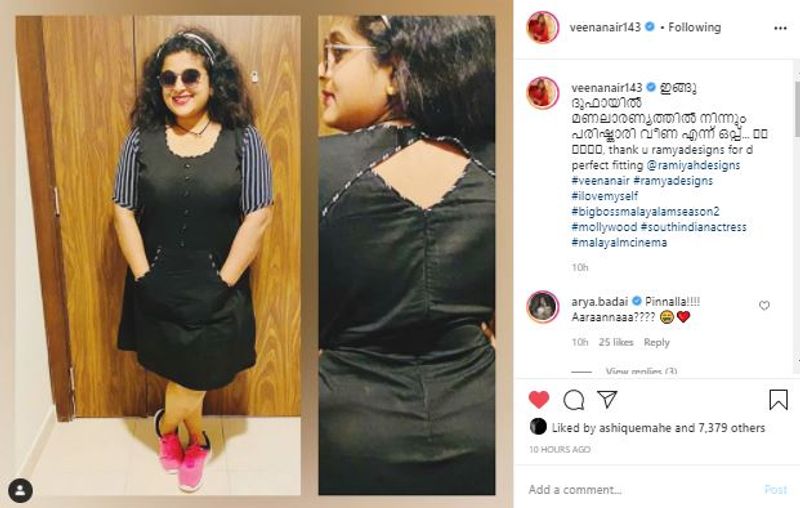 'ഇങ്ങു ദുഫായില് മണലാരണ്യത്തില് നിന്നും പരിഷ്കാരി വീണ.. എന്ന് ഒപ്പ്' എന്ന ക്യാപ്ഷനോടെയാണ് വീണ ചിത്രം പങ്കുവച്ചിരിക്കുന്നത്. 'പിന്നല്ല.. ആരാന്നാ...' എന്നാണ് ചിത്രത്തിന് ആര്യ കമന്റ് ചെയ്തിരിക്കുന്നത്. കറുത്ത ഫ്രോക്കിനു മുകളില് ഡെനിം കോട്ടിട്ട വീണയുടെ ചിത്രം അടുത്തിടെ സോഷ്യല്മീഡിയയില് വൈറലായിരുന്നു. പിന്നാലെയാണ് വീണയുടെ പുതിയ ഫ്രോക്ക്.