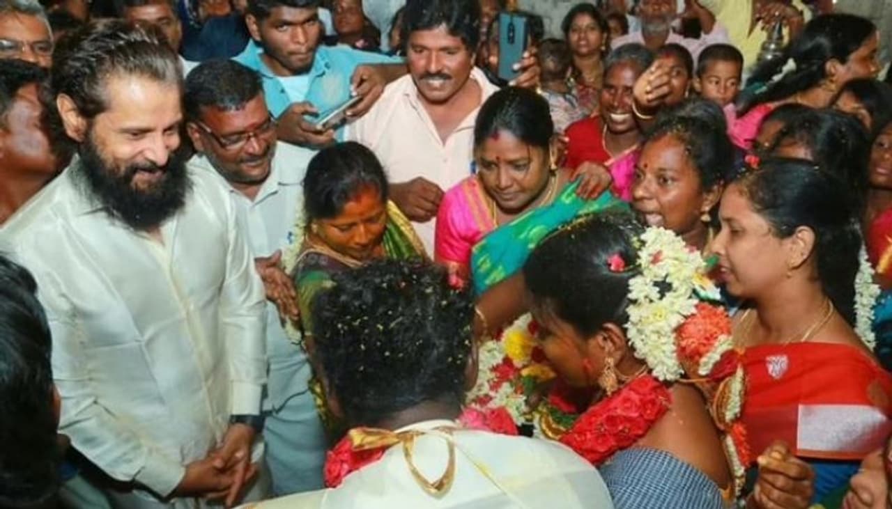 ഒപ്പം പ്രവര്ത്തിക്കുന്നവരോട് ഒരു ഹൃദയബന്ധം സൂക്ഷിക്കുന്നയാളാണ് നടന് വിക്രം, അത് സിനിമയിലായാലും പുറത്തായാലും. ഇപ്പോഴിതാ സോഷ്യല് മീഡിയയില് വിക്രം പങ്കെടുത്ത ഒരു വിവാഹ ചടങ്ങില് നിന്നുള്ള ദൃശ്യങ്ങള് വൈറല് ആവുകയാണ്. 40 വര്ഷത്തോളം വിക്രത്തിന്റെ വീട്ടുജോലിക്കാരനായി പ്രവര്ത്തിച്ച ഒളിമാരന്റെ മകന് ദീപക്കിന്റെയും വര്ഷിണിയുടെയും വിവാഹത്തിന്റെ ദൃശ്യങ്ങള് ആണത്. അടുത്തിടെയായിരുന്നു ഒഴിമാരന്റെ മരണം. അദ്ദേഹത്തിന്റെ ഭാര്യ മേരിയും ദീര്ഘകാലമായി വിക്രത്തിന്റെ സഹായിയായി പ്രവര്ത്തിക്കുന്നയാളാണ്.