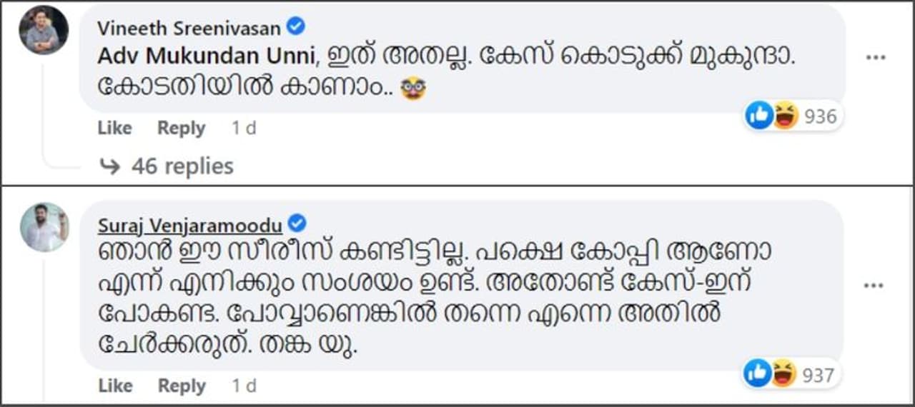 ഇത് അതല്ല. കേസ് കൊടുക്ക് മുകുന്ദാ, കോടതിയില് കാണാം എന്നാണ് ഈ പോസ്റ്റിന് വിനീത് ശ്രീനിവാസന് നല്കിയിരിക്കുന്ന കമന്റ്. ഞാൻ ഈ സീരീസ് കണ്ടിട്ടില്ല. പക്ഷെ കോപ്പി ആണോ എന്ന് എനിക്കും സംശയം ഉണ്ട്. അതോണ്ട് കേസിന് പോകണ്ട. പോവാണെങ്കില് തന്നെ എന്നെ അതിൽ ചേർക്കരുത്. താങ്ക്യൂ എന്നാണ് ചിത്രത്തില് മറ്റൊരു കഥാപാത്രത്തെ അവതരിപ്പിച്ചിരിക്കുന്ന സുരാജ് വെഞ്ഞാറമൂടിന്റെ ഹാസ്യരൂപേണയുള്ള കമന്റ്.