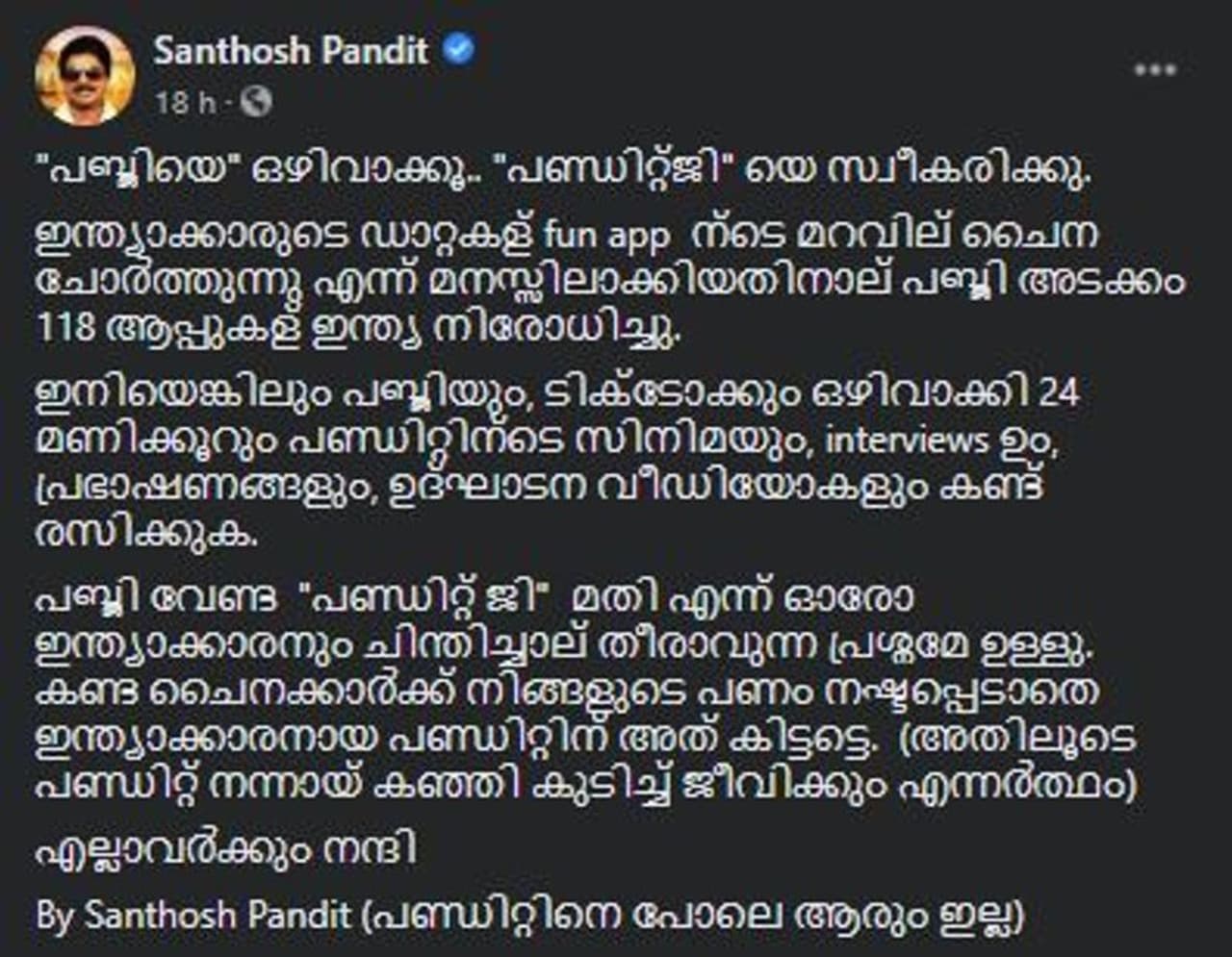 സന്തോഷ് പണ്ഡിറ്റിനെ അറിയാത്ത മലയാളികളില്ല. സിനിമകളിലെ വ്യത്യസ്തതയും അതുപോലുള്ള അഭിനയ രീതിയും ഒക്കെയായി കുറച്ചുകാലമായി പണ്ഡിറ്റ് മലയാളികൾക്കിടയിലുണ്ട്. അദ്ദേഹത്തിന്റെ സോഷ്യൽ മീഡിയ പോസ്റ്റുകളിലുമുണ്ട് വ്യത്യസ്തത. അത്തരത്തിൽ ഒരു കുറിപ്പാണ് ഇപ്പോൾ ശ്രദ്ധേയമാകുന്നത്. പബ്ജി നിരോധിച്ച സാഹചര്യത്തിൽ ഫേസ്ബുക്കിലിട്ട കുറിപ്പ് ഇതിനോടകം വൈറലായക്കഴിഞ്ഞു. എന്നാണ് സന്തോഷ് പണ്ഡിറ്റ് കുറിച്ചിരിക്കുന്നത്.