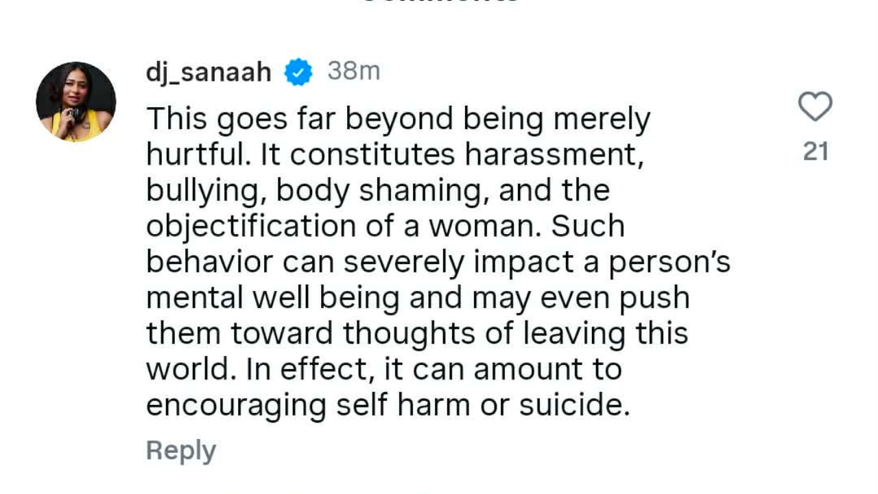 ഇത് വേദനയ്ക്കും അപ്പുറമായ കാര്യമാണെന്നും ബോഡി ഷെയ്മിങും പരിഹാസങ്ങളും ജീവഭയമുണ്ടാക്കുന്നതാണ് എന്നുമാണ് സന കുറിച്ചിരിക്കുന്നത്. "ഇത് കേവലം വേദന മാത്രമല്ല. അതിനും അപ്പുറമാണ്. ഇത് നിരന്തരമായ ഉപദ്രവവും ഭീഷണിപ്പെടുത്തലും ബോഡി ഷെയ്മിങ്ങുമാണ്. ഒരു സ്ത്രീയുടെ വസ്തുനിഷ്ഠതയും. ഇത്തരം പ്രവർത്തികൾ ഒരു വ്യക്തിയുടെ മാനസികാരോഗ്യത്തെ സാരമായി ബാധിക്കും. ഈ ലോകത്തോട് വിട പറയണമെന്ന ചിന്തകളിലേക്ക് അവരെ തള്ളിവിടുകയാണ് ചെയ്യുന്നത്. ഫലത്തിൽ, അത് സ്വയം ഉപദ്രവിക്കുന്നതിനോ ആത്മഹത്യ ചെയ്യുന്നതിനോ പ്രേരിപ്പിക്കുന്നത് തുല്യമാണ്", എന്നാണ് സന കമന്റിൽ കുറിച്ചിരിക്കുന്നത്. പിന്നാലെ പലരും പരിഹാസവുമായി എത്തിയെങ്കിലും ഇതൊന്നും കാര്യമാക്കേണ്ടെന്നും മുന്നോട്ട് പോകൂവെന്ന് പറഞ്ഞ് ആശ്വസിപ്പിക്കുന്നവരും ധാരാളമാണ്.