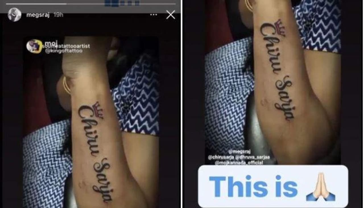 ചിരഞ്ജീവിയുടെ പേര് ശരീരത്തിൽ പച്ചകുത്തിയാണ് ആരാധിക സ്നേഹം പ്രകടിപ്പിച്ചത്. ഒരു കിരീടത്തോടൊപ്പം ചീരുവിന്റെ പേര് ടാറ്റൂ ചെയ്തിരിക്കുന്ന ചിത്രം ആരാധിക പങ്കുവച്ചു. ചിരഞ്ജീവി എന്ന പേരിൻ്റെ ആദ്യ അക്ഷരമായ സി യുടെ മുകളിലായി കിരീടം ഉള്ളതാണ് ടാറ്റൂവിൻ്റെ ഡിസൈൻ. നന്ദി സൂചകമായാണ് മേഘ്ന ഈ ചിത്രം ഇൻസ്റ്റാഗ്രാമിൽ പങ്കുവച്ചിട്ടുണ്ട്. നന്ദി പറയാൻ വാക്കുകളില്ലെന്ന് സൂചിപ്പിക്കുന്നതായിരുന്നു മേഘ്നയുടെ പ്രതികരണം.