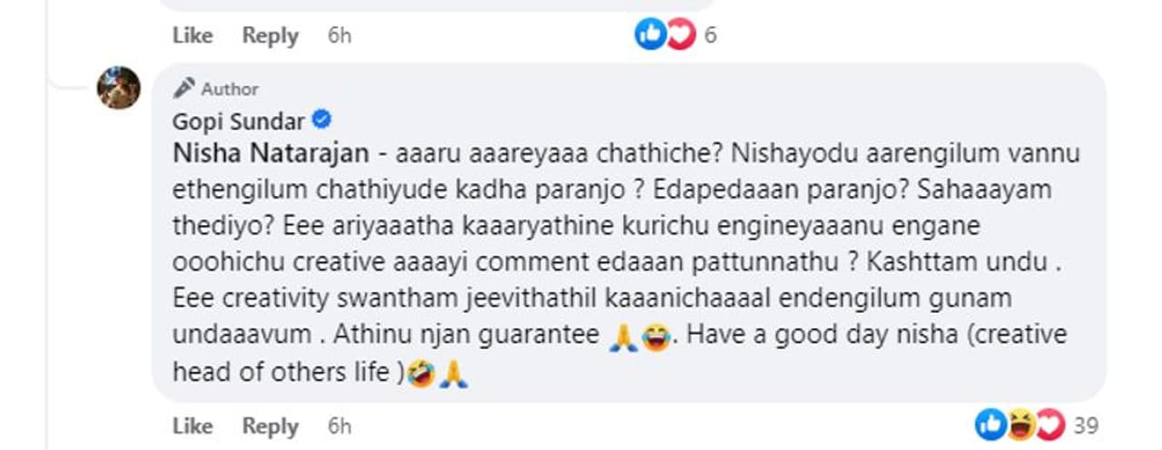 'ആര് ആരെയാ ചതിച്ചേ ? നിങ്ങളോട് ആരെങ്കിലും വന്ന് ഏതെങ്കിലും ചതിയുടെ കഥ പറഞ്ഞോ ? ഇടപെടാൻ പറഞ്ഞോ? സഹായം തേടിയോ? ഈ അറിയാത്ത കാര്യത്തിനെ കുറിച്ച് എങ്ങനെയാണ് ഇങ്ങനെ ഊഹിച്ച് ഇത്രയും ക്രിയേറ്റീവ് ആയി കമന്റിടാൻ പറ്റുന്നത് ? കഷ്ടം ഉണ്ട്. ഈ ക്രിയേറ്റിവിറ്റി സ്വന്തം ജീവിതത്തിൽ കാണിച്ചാൽ എന്തെങ്കിലും ഗുണം ഉണ്ടാവും. അതിന് ഞാൻ ഗാരന്റി. നല്ലൊരു ദിവസം നേരുന്നു. ഈ ക്രിയേറ്റിവിറ്റി സ്വന്തം ജീവിതത്തിൽ കാണിച്ചാൽ എന്തെങ്കിലും ഗുണം ഉണ്ടാകും. അതിനു ഞാൻ ഗ്യാരന്റി, നല്ലൊരു ദിവസം നേരുന്നു. (creative head of others life )', എന്നായിരുന്നു ഗോപി സുന്ദറിന്റെ മറുപടി. പിന്നാലെ നിരവധി പേരാണ് ഗോപി സുന്ദറിനെ സപ്പോർട്ട് ചെയ്തും വിമർശിച്ചും രംഗത്തെത്തിയത്.