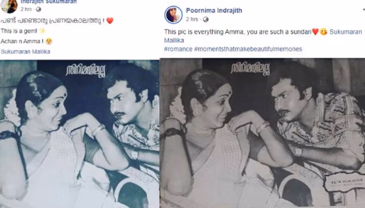 അച്ഛനും അമ്മയും പ്രണയിച്ചിരുന്ന കാലത്തെ ഒരു അപൂര്വചിത്രമാണിതെന്ന് ഇരുവരും പറയുന്നു. ഫേസബുക്കിലൂടെയാണ് താരങ്ങൾ ചിത്രം പങ്കുവച്ചിരിക്കുന്നത്. ''ഈ ചിത്രത്തില് എല്ലാമുണ്ട്... അമ്മ എന്തൊരു സുന്ദരിയാണ്'', എന്ന അടിക്കുറിപ്പോടെയായിരുന്നു പൂര്ണിമ ചിത്രം പങ്കുവച്ചത്. എന്നാൽ, ഇതേ ചിത്രം ''പണ്ടു പണ്ടൊരു പ്രണയകാലത്ത്'' എന്ന അടിക്കുറിപ്പോടെയാണ് ഇന്ദ്രജിത്ത് പങ്കുവച്ചത്.
