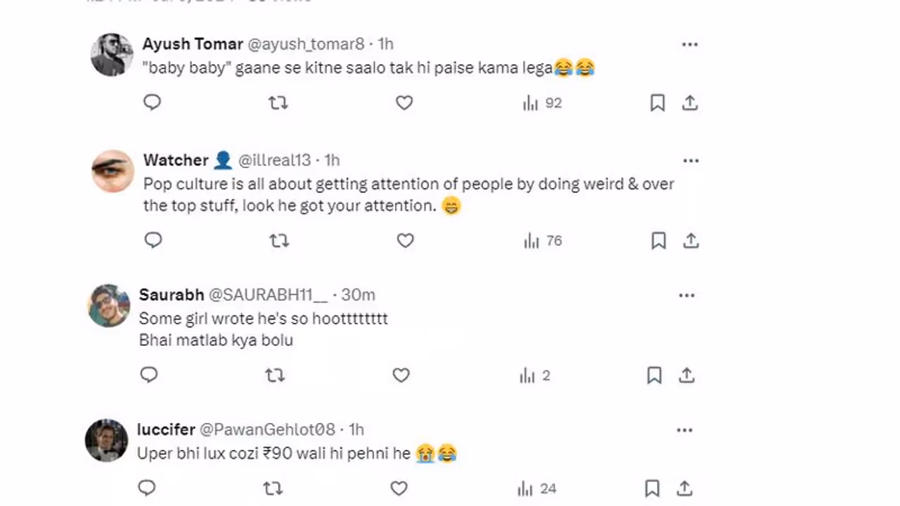 "ഇത് ഏത് തരത്തിലുള്ള ഫാഷനാണെന്ന് ആർക്കെങ്കിലും വിശദീകരിക്കാമോ? ജസ്റ്റിൻ ബീബർ ശരാശരി ഇന്ത്യൻ അമ്മാവന്റെ വള്ളി ട്രൗസര് ധരിച്ചാണ് സംഗീത നിശയ്ക്ക് എത്തിയത്" മറ്റൊരു ഉപയോക്താവ് "ഇതൊരു ഫാഷൻ ആണോ?" എന്നാണ് ചോദിക്കുന്നത്.