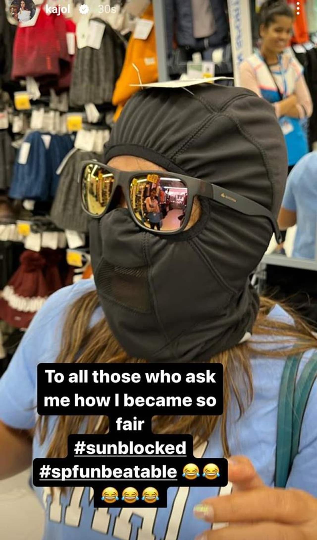 സ്റ്റോറിയായി ഷെയര് ചെയ്ത ഫോട്ടോയില് കജോൾ മുഖം മറച്ചാണ് പ്രത്യക്ഷപ്പെട്ടിരിക്കുന്നത്. താരം സൺഗ്ലാസുള്ള ഒരു നീല ടീ ഷർട്ട് ധരിച്ചിരുന്നു. ഏതോ സ്റ്റോറില് നിന്നുള്ള ക്ലിക്കാണ് ഇതെന്ന് വ്യക്തമാണ്. ഫോട്ടോ ഷെയര് ചെയ്തുകൊണ്ട് എങ്ങനെ സുന്ദരിയായി ഇരിക്കുന്നു എന്ന ചോദ്യം ചോദിക്കുന്നവരെ ട്രോളുന്നുണ്ട് താരം, ചിത്രത്തിലെ ക്യാപ്ഷനില് “ഞാൻ എങ്ങനെ ഇത്ര സുന്ദരിയായെന്ന് ചോദിക്കുന്ന എല്ലാവര്ക്കും വേണ്ടി #sunblocked #spfunbeatable.” ഈ ഹാഷ്ടാഗില് ബാക്കി കാര്യം ഉണ്ടെന്നാണ് സോഷ്യല് മീഡിയ ഇപ്പോള് കണ്ടെത്തിയത്.