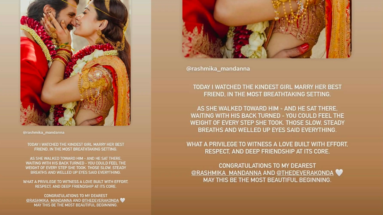 "വിസ്മയകരമായ ചുറ്റുപാടിൽ, ഏറ്റവും ദയയുള്ള പെൺകുട്ടി തന്റെ ഉറ്റ സുഹൃത്തിനെ വിവാഹം ചെയ്യുന്നതിന് സാക്ഷിയാകാൻ എനിക്ക് സാധിച്ചു. പുറം തിരിഞ്ഞ് ആയൾ അവൾക്ക് വേണ്ടി കാത്തിരിക്കവെ, അവനെ ലക്ഷ്യമാക്കി അവൾ നടന്നുവരുമ്പോൾ, അവളുടെ ഓരോ ചുവടിലേയും ഭാരം എനിക്കും അനുഭവിക്കാൻ കഴിഞ്ഞു. സാവധാനത്തിലുള്ള നടത്തത്തിൽ ആ നിറഞ്ഞ കണ്ണുകളിൽ എല്ലാമുണ്ടായിരുന്നു. അവരുടെ പ്രയത്നവും ബഹുമാനവും അഗാധമായ സൗഹൃദവും കൊണ്ട് വളർത്തിയെടുത്ത സ്നേഹത്തിന് സാക്ഷ്യം വഹിക്കാൻ സാധിച്ചത് ഭാഗ്യമായി കരുതുകയാണ്. ഏറെ പ്രിയപ്പെട്ട രശ്മികയക്കും വിജയ്ക്കും അഭിനന്ദനങ്ങൾ. ഏറ്റവും മനോഹരമായ ഒന്നിന്റെ തുടക്കമാകട്ടെ ഇത്", എന്നാണ് കല്യാണി പ്രിയദർശൻ കുറിച്ചത്.