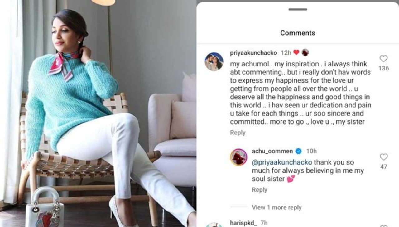 പ്രിയയുടെ കമന്റിന് മറുപടിയുമായി അച്ചു ഉമ്മനും രംഗത്തെത്തി. "എപ്പോഴും എന്നിൽ വിശ്വസിക്കുന്നതിന് ഒരുപാട് നന്ദി എന്റെ സഹോദരി", എന്നാണ് അച്ചു കുറിച്ചത്. പിന്നാലെ നിരവധി പേർ കമന്റുകളുമായി രംഗത്ത് എത്തിയിട്ടുണ്ട്. ഉമ്മൻ ചാണ്ടിയുടെ കുടുംബവുമായി അടുത്ത സൗഹൃദവും ബന്ധവും കാത്തു സുക്ഷിക്കുന്നവരാണ് കുഞ്ചാക്കോ ബോബനും കുടുംബവും.