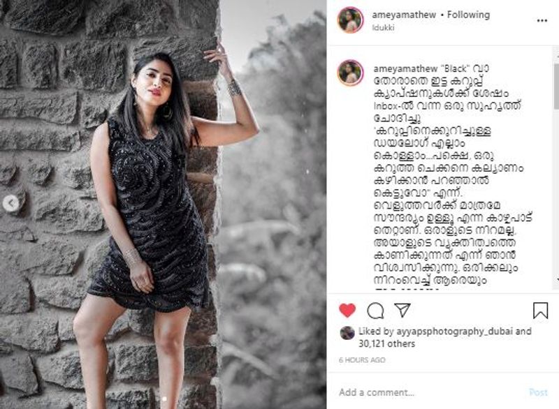 ' 'ബ്ലാക്ക്' വാ തോരാതെ ഇട്ട കറുപ്പ് ക്യാപ്ഷനുകള്ക്ക് ശേഷം ഇന്ബോക്സില് വന്ന ഒരു സുഹൃത്ത് ചോദിച്ചു 'കറുപ്പിനെക്കുറിച്ചുള്ള ഡയലോഗ് എല്ലാം കൊള്ളാം. പക്ഷെ, ഒരു കറുത്ത ചെക്കനെ കല്യാണം കഴിക്കാന് പറഞ്ഞാല് കെട്ടുവോ' എന്ന്. വെളുത്തവര്ക്ക് മാത്രമേ സൗന്ദര്യം ഉള്ളൂ എന്ന കാഴ്ചപാട് തെറ്റാണ്. ഒരാളുടെ നിറമല്ല, അയാളുടെ വ്യക്തിത്വത്തെ കാണിക്കുന്നത് എന്ന് ഞാന് വിശ്വസിക്കുന്നു. ഒരിക്കലും നിറംവെച്ച് ആരെയും അളക്കാനോ.. കുറച്ചുകാണാനോ ശ്രമിക്കാതിരിക്കുക. എന്നാണ് അമേയ തന്റെ പുതിയ ചിത്രത്തോടൊപ്പം കുറിച്ചിരിക്കുന്നത്. നിരവധി ആളുകളാണ് താരത്തിന് പിന്തുണയുമായി എത്തുന്നത്.